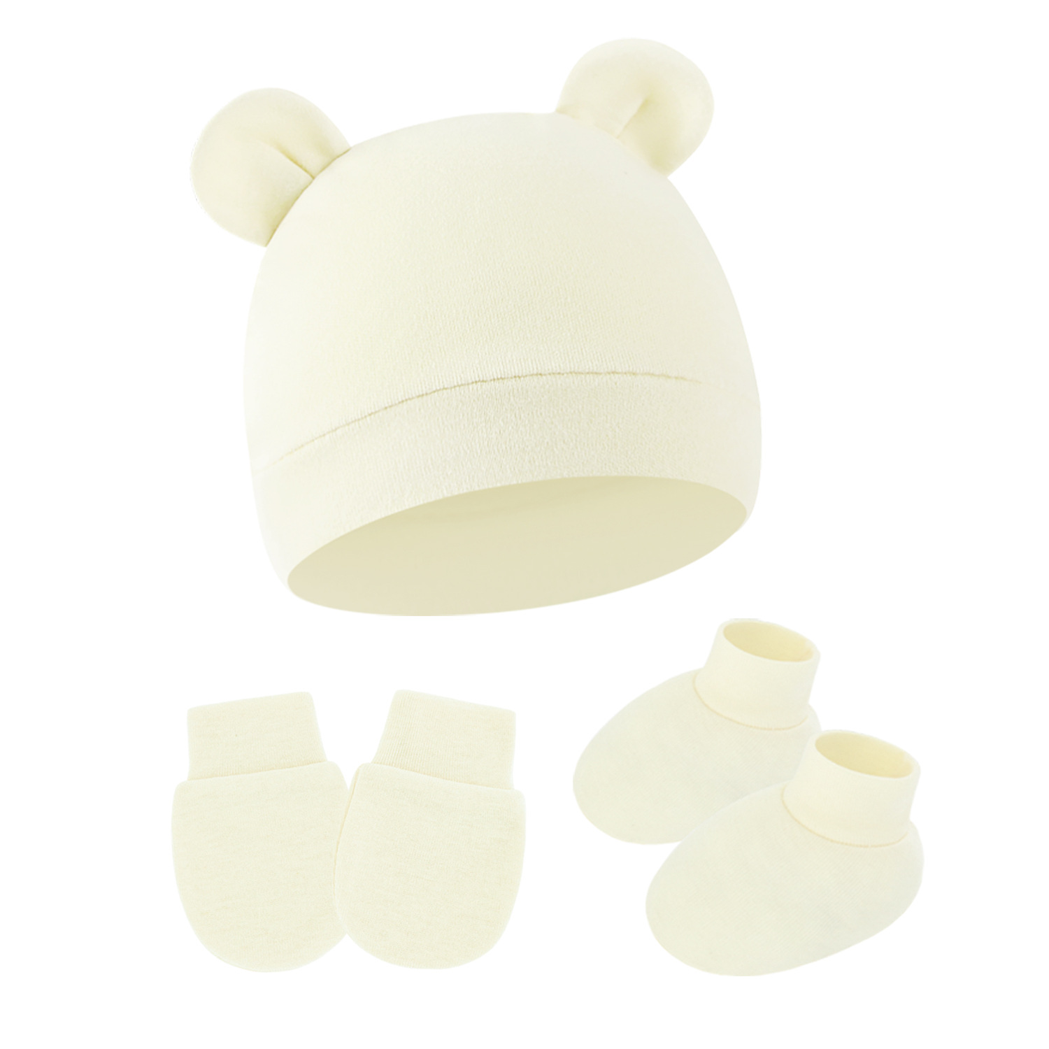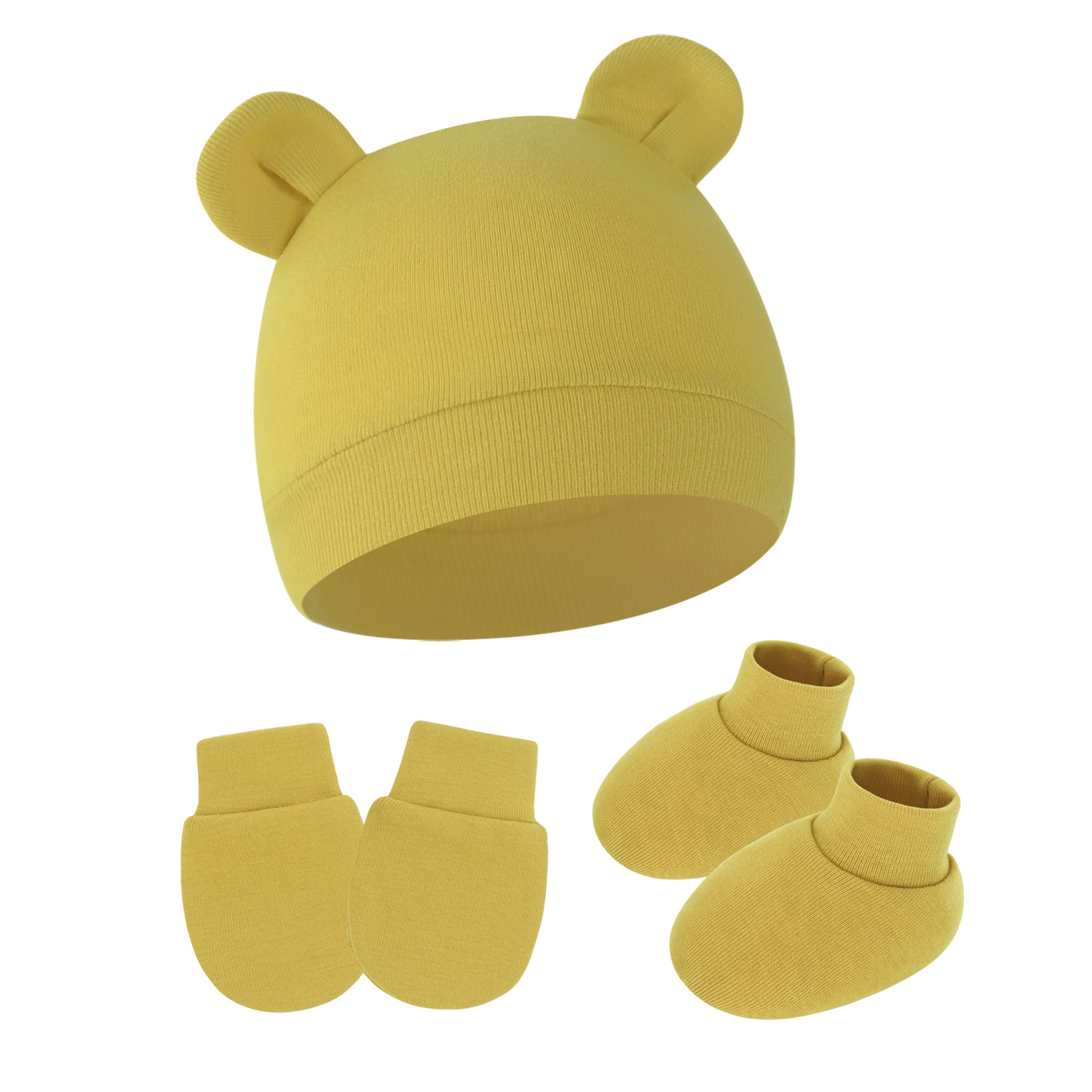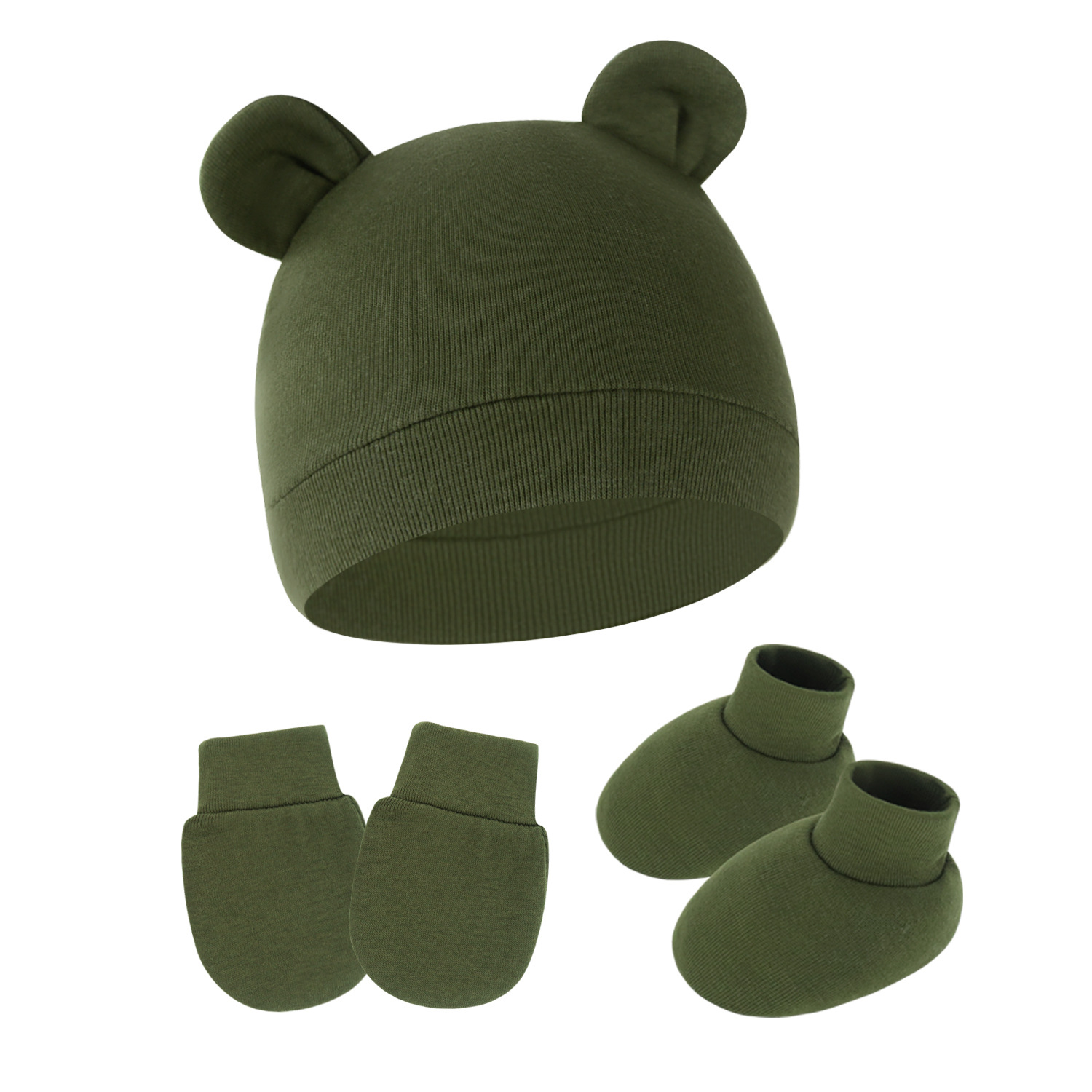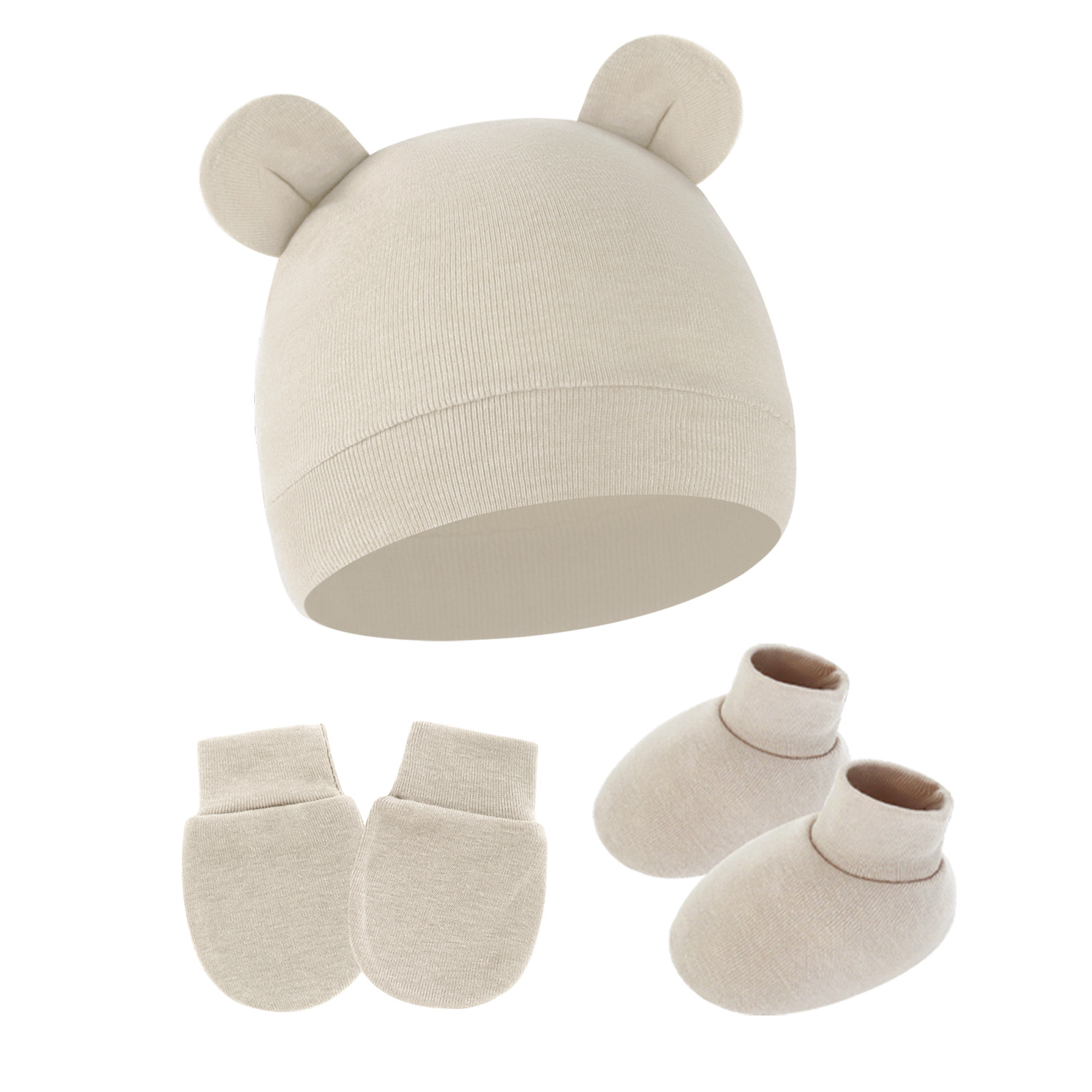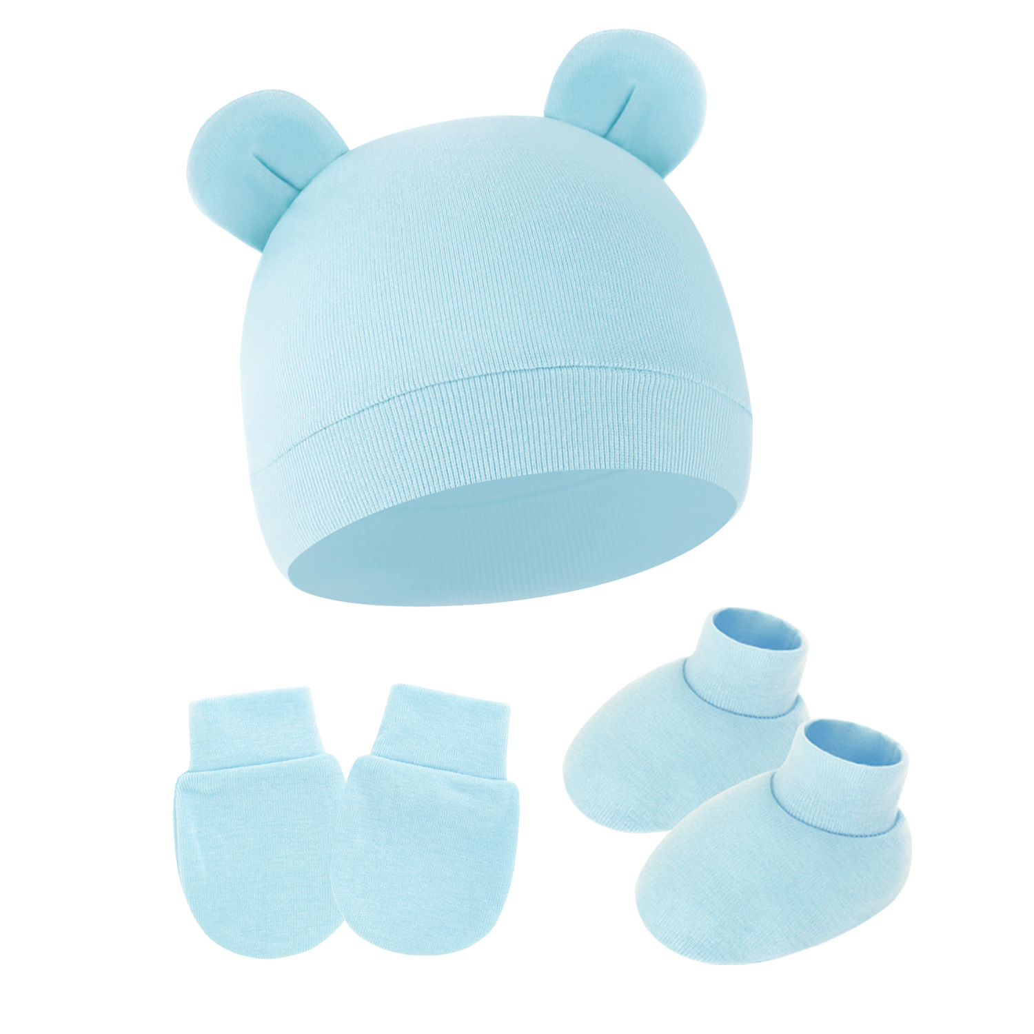 대외 무역 단색 아기 풀오버 모자 귀 아기 태아 모자 장갑 발 세트 3 조각 세트 0-6 개월스토어 가기
