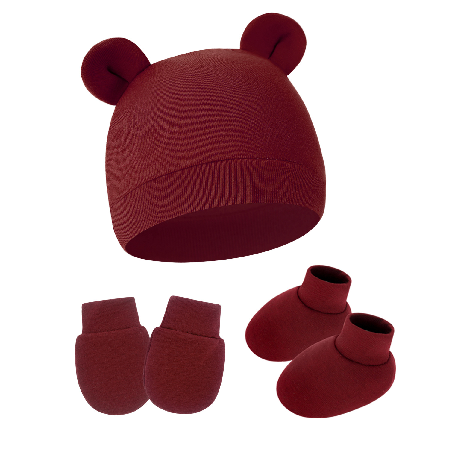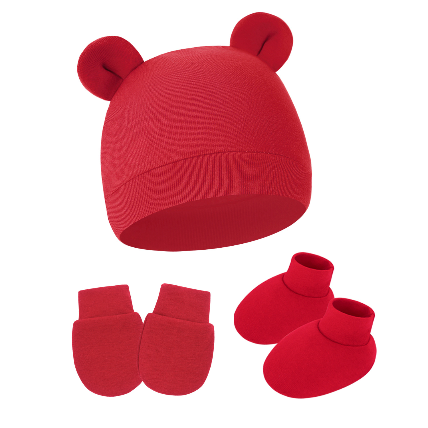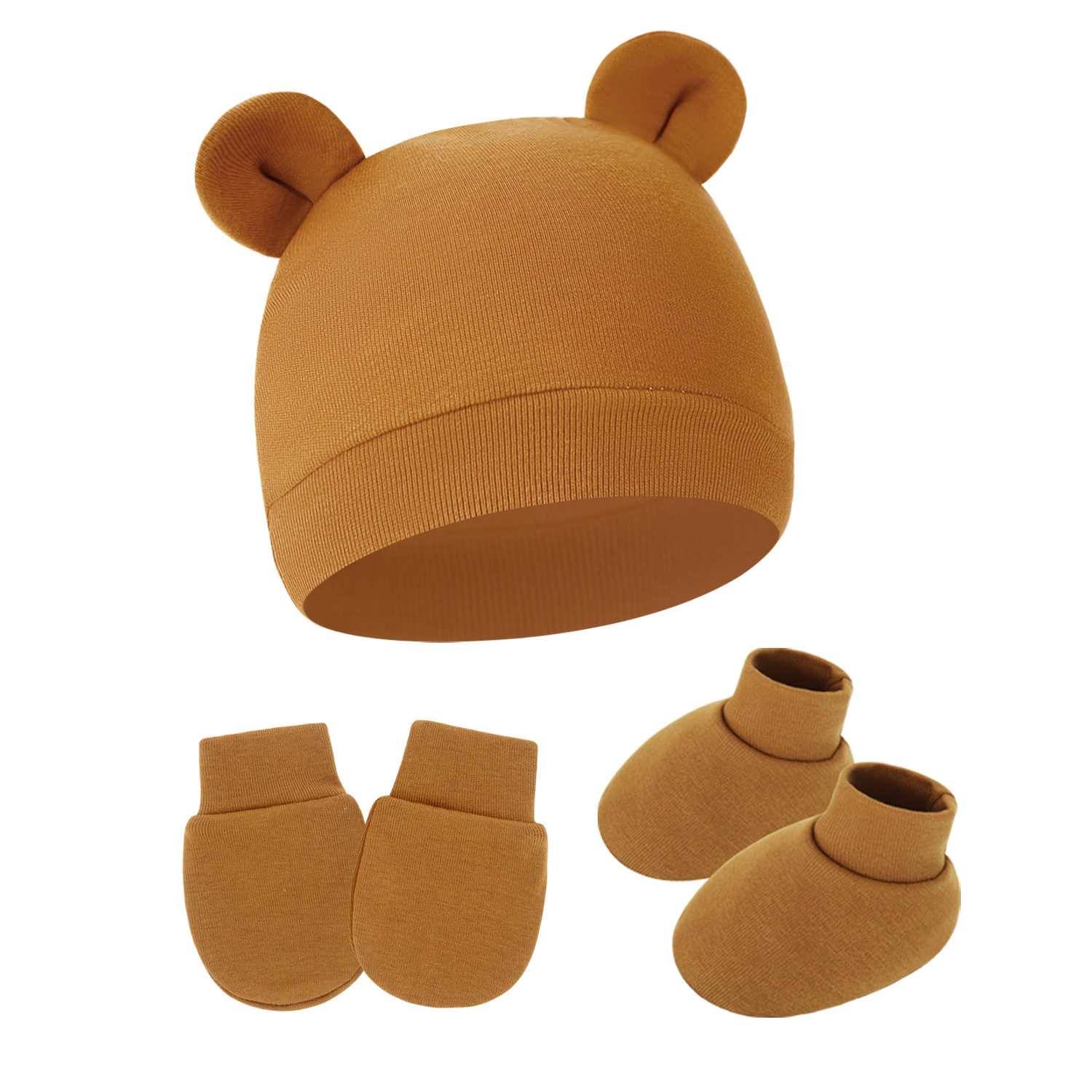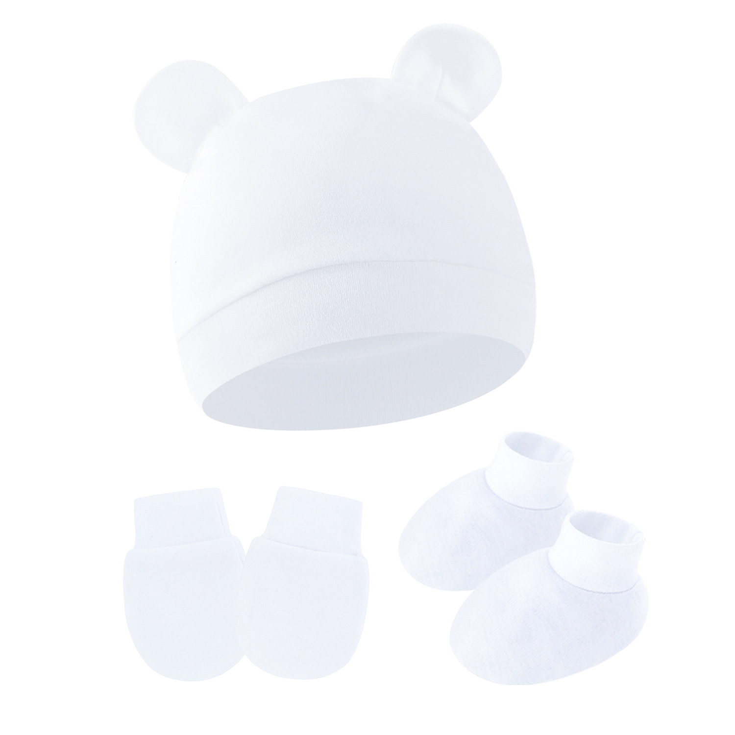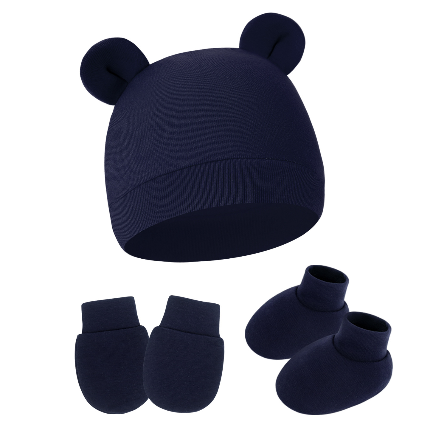 대외 무역 단색 아기 풀오버 모자 귀 아기 태아 모자 장갑 발 세트 3 조각 세트 0-6 개월스토어 가기