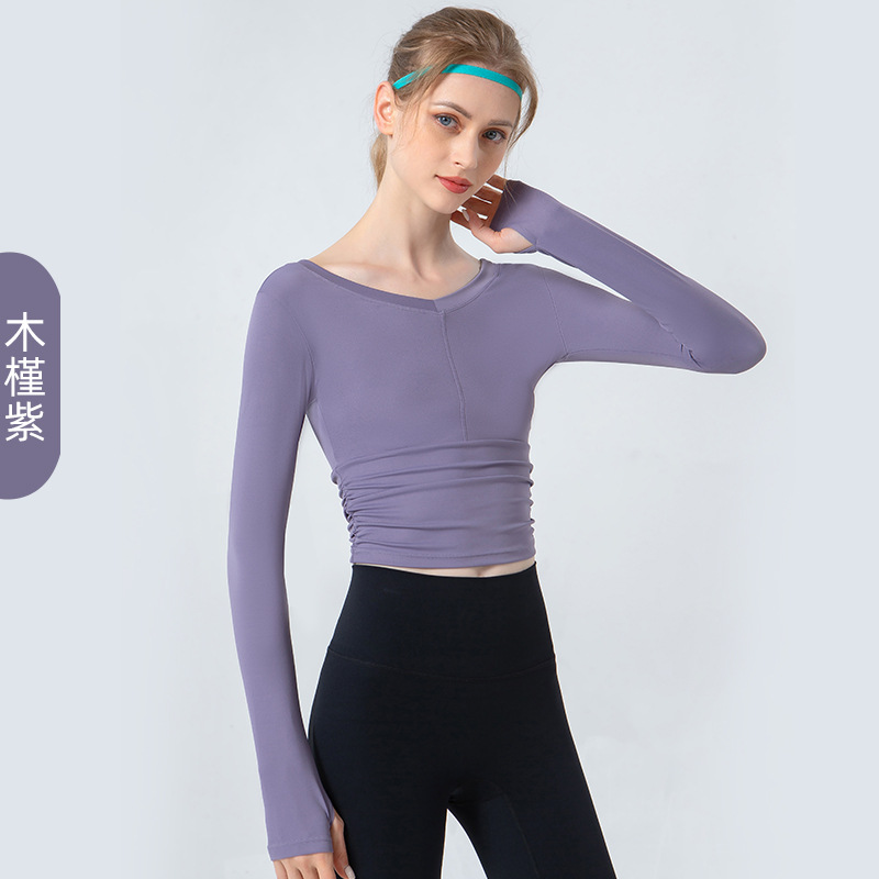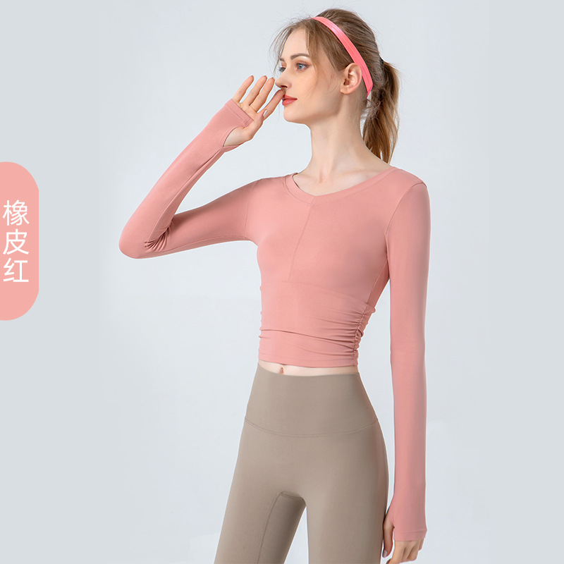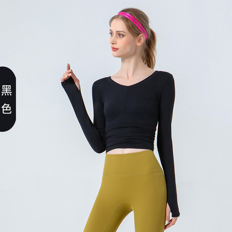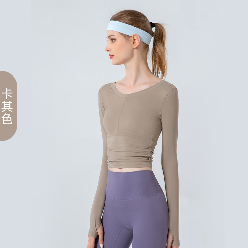 가을 겨울 신상 요가 긴팔 클라우드 피부친화 타이트 크롭 스포츠웨어 브이넥 슬림 플리츠 피트니스 탑