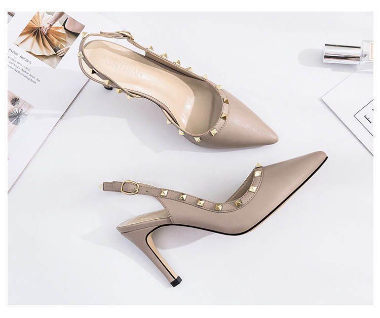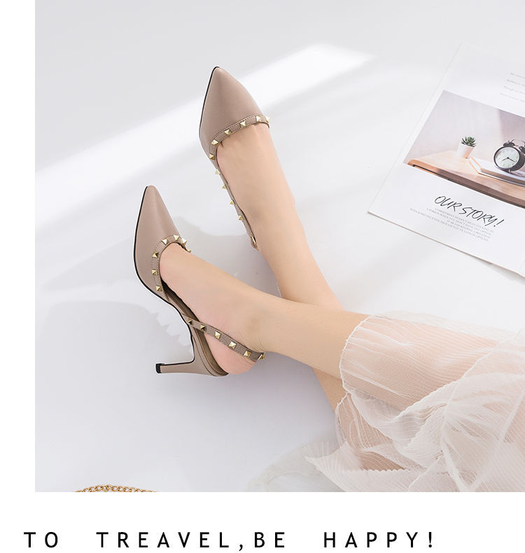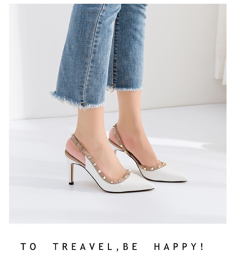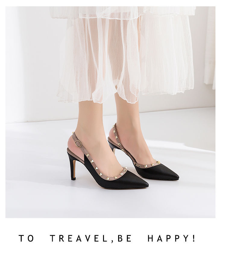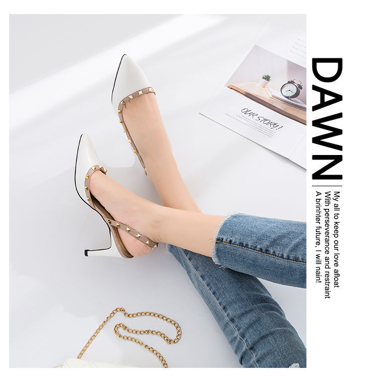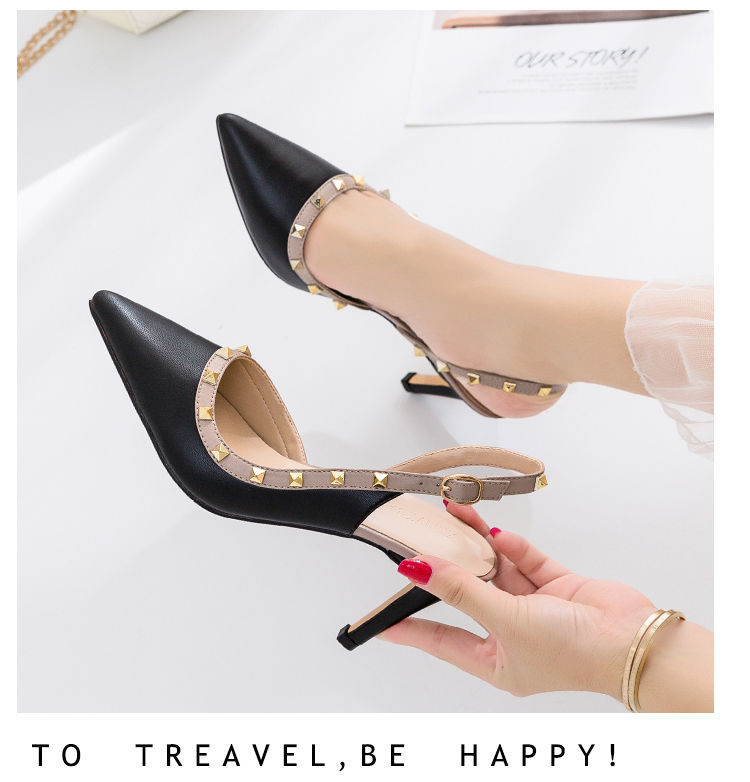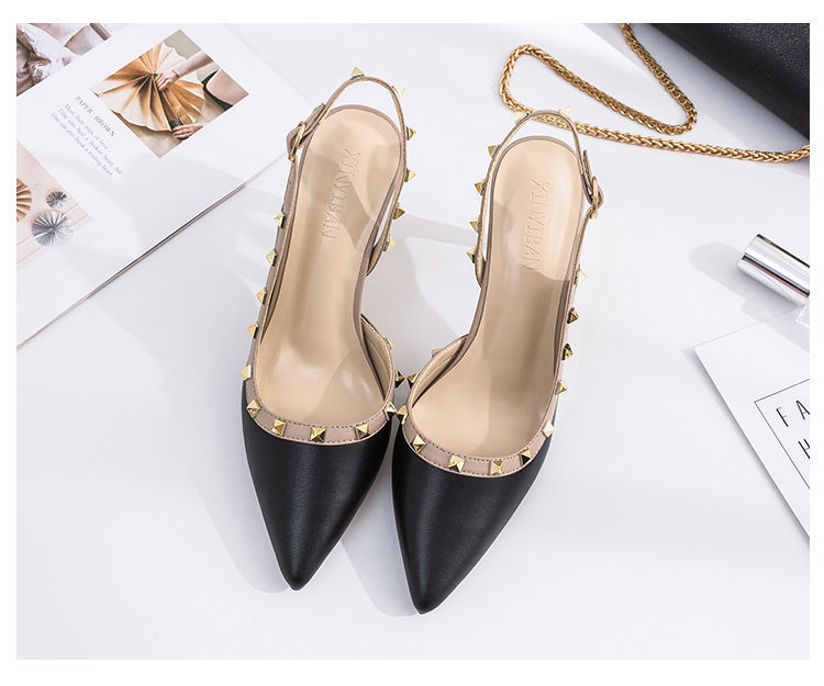 柳丁包头凉鞋女细跟 2024欧美V尖头铆钉高跟鞋中跟网红名媛伴娘鞋