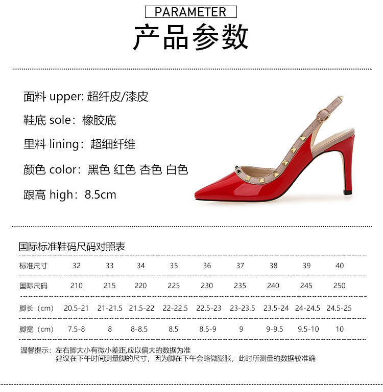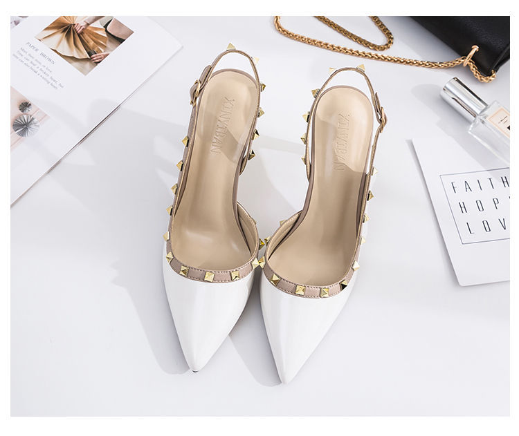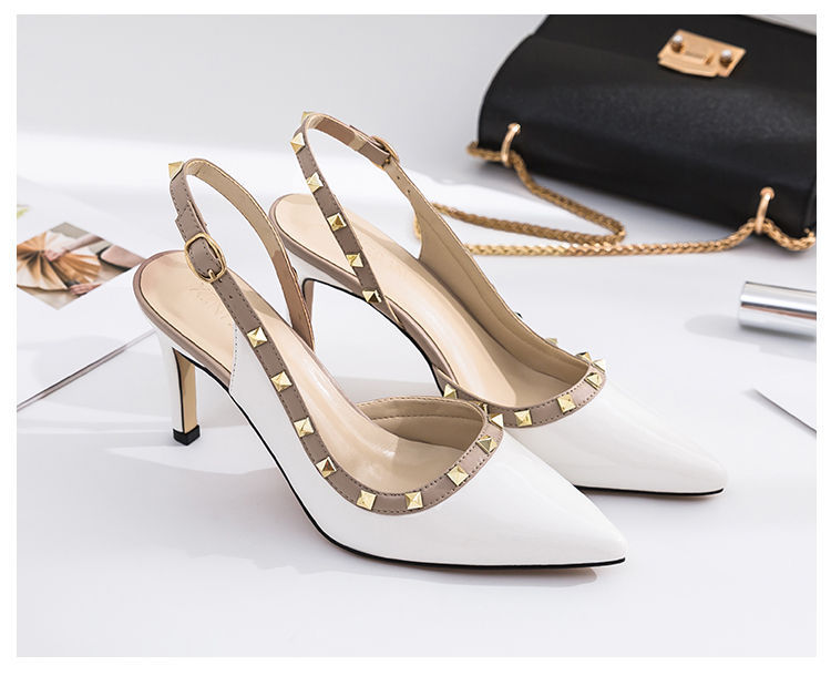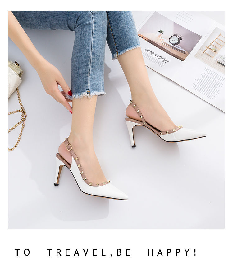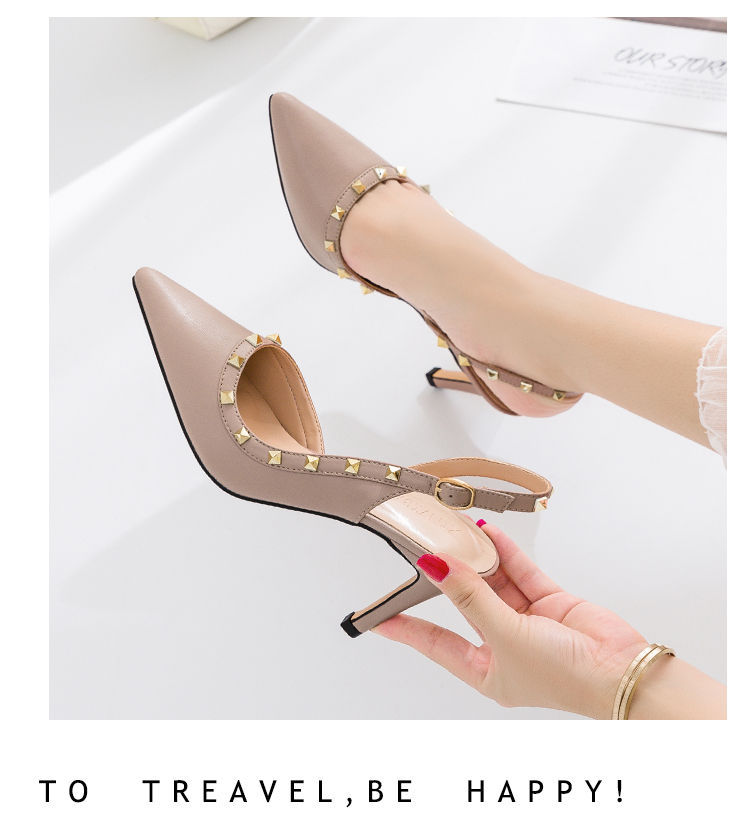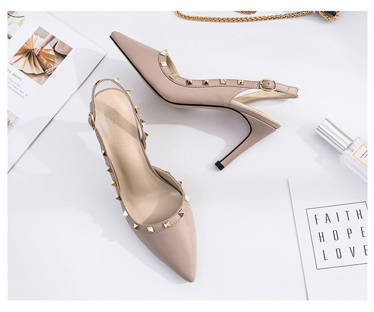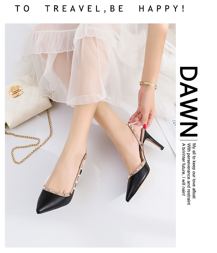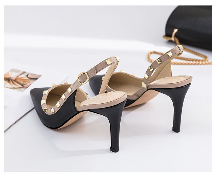 柳丁包头凉鞋女细跟 2024欧美V尖头铆钉高跟鞋中跟网红名媛伴娘鞋