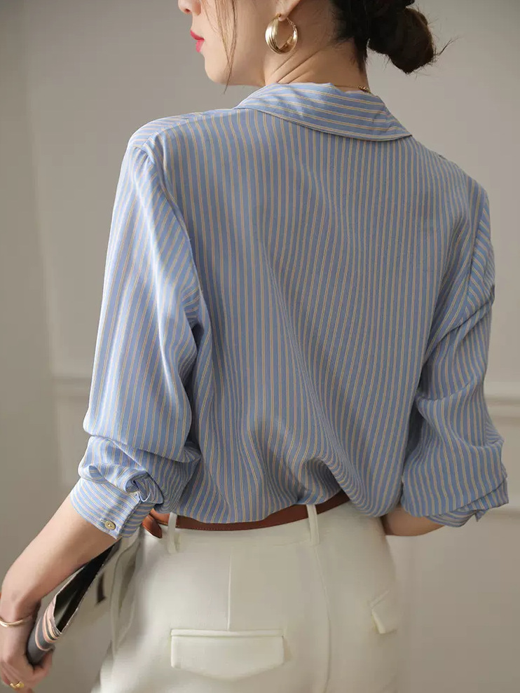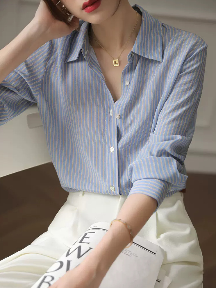 여성을위한 파란색 줄무늬 실크 같은 셔츠 2022 새로운 틈새 세련된 느슨한 여름과 가을 긴 소매 고급 질감 셔츠스토어 가기