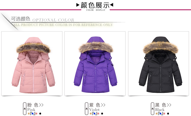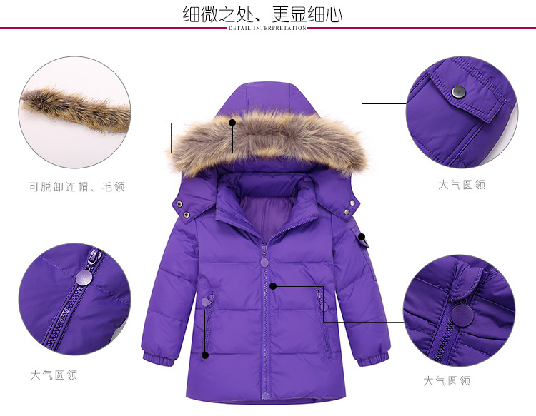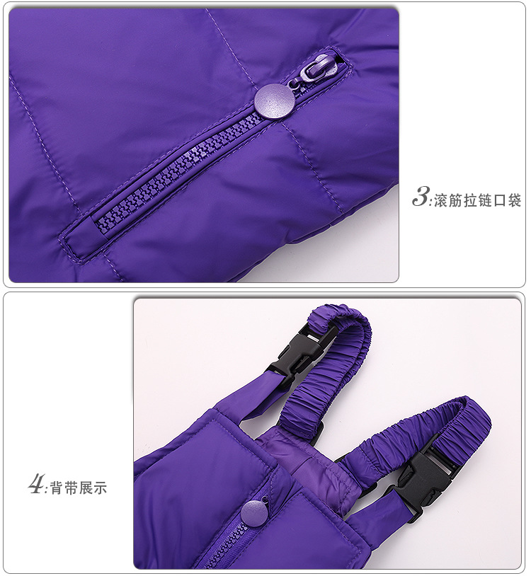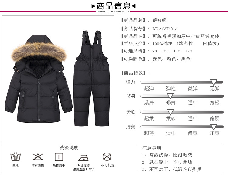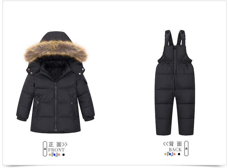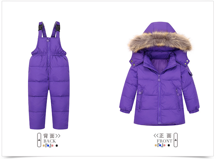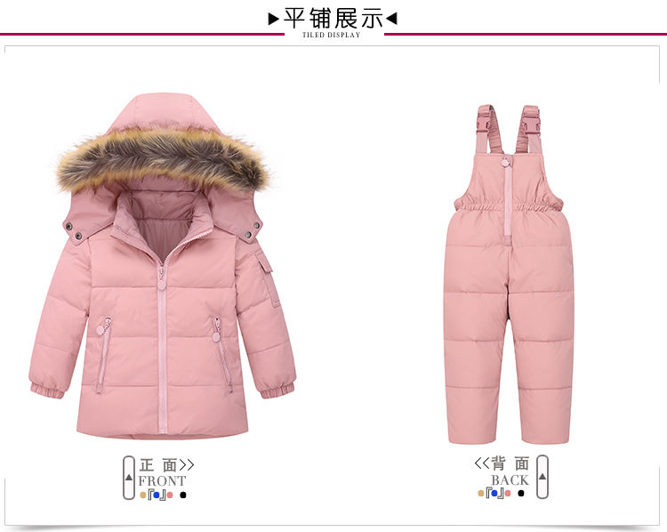 탈부착 가능한 후드와 퍼 칼라가 있는 아동용 보온 스키복 세트 (상의+멜빵바지)스토어 가기