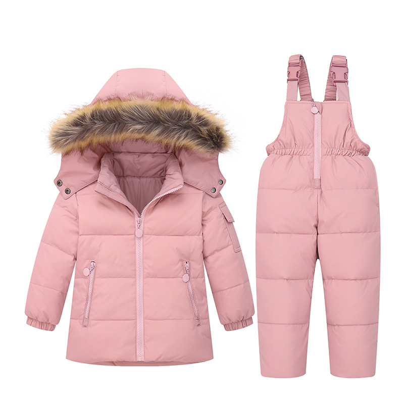 탈부착 가능한 후드와 퍼 칼라가 있는 아동용 보온 스키복 세트 (상의+멜빵바지)