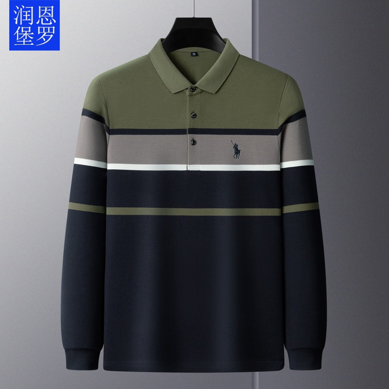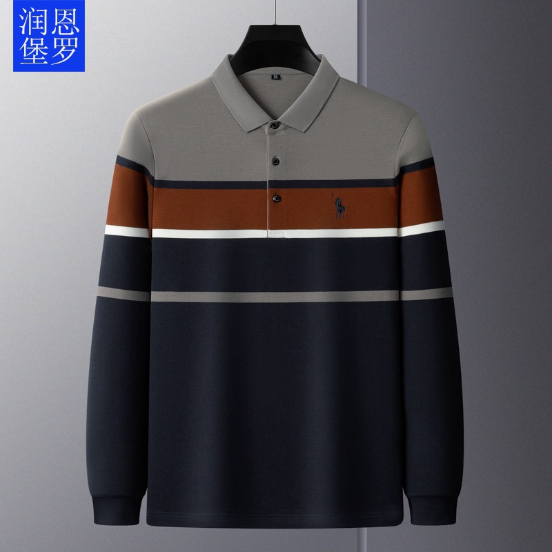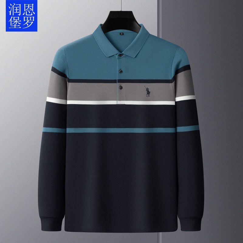 Runenboro 가을과 겨울 남성용 긴팔 티셔츠 스트라이프 라펠 자수 중년 아빠 탑 베이스 셔츠 재고