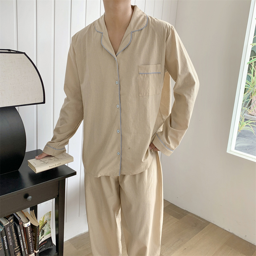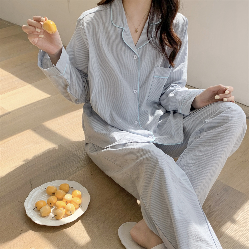 한국식 봄 · 가을 심플한 줄무늬 인터넷 연예인 커플 잠옷 긴팔 여성 느슨한 캐주얼 홈 세트 남성 세트