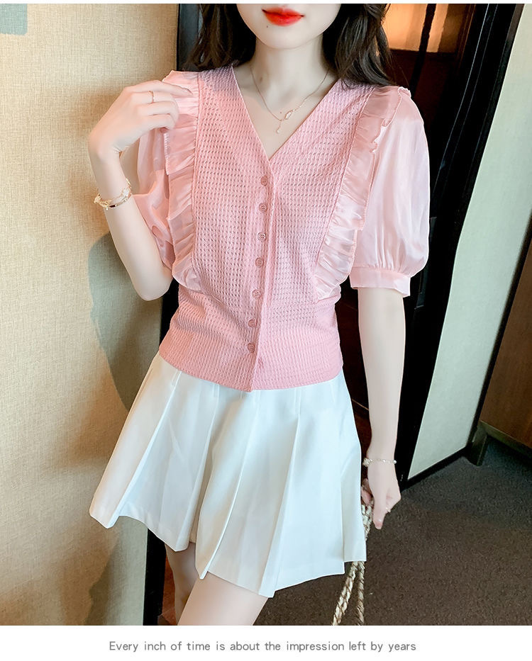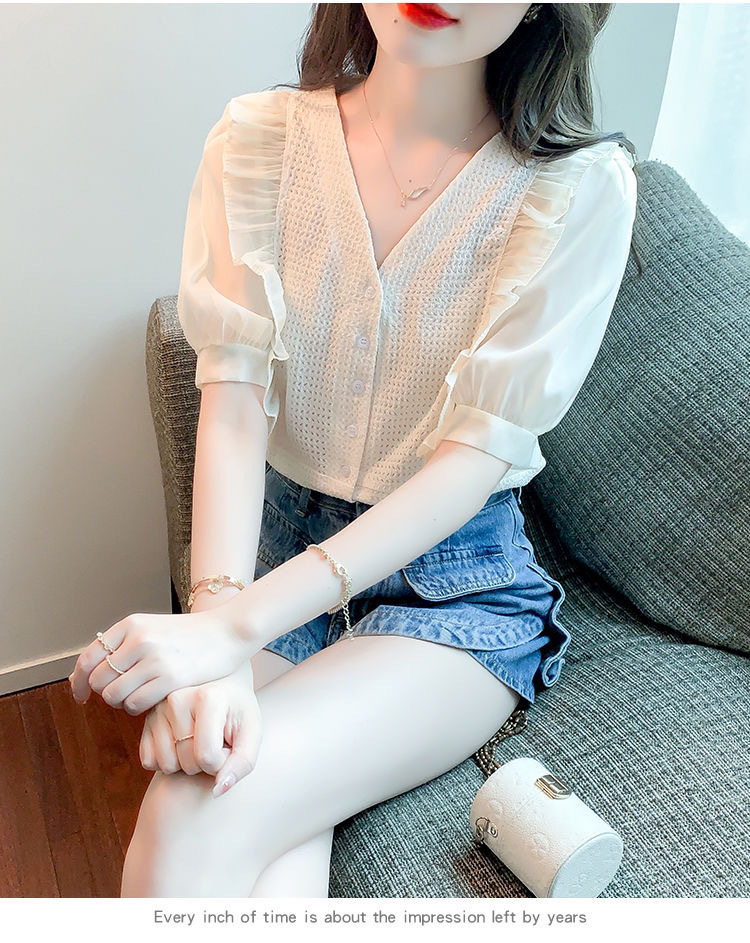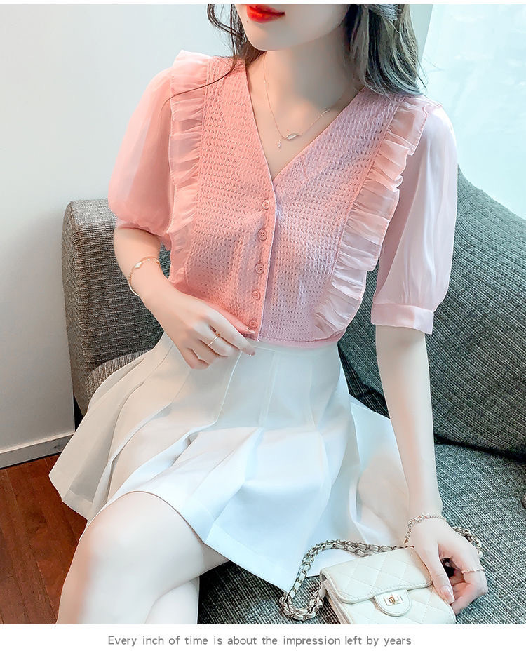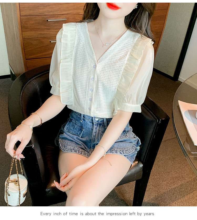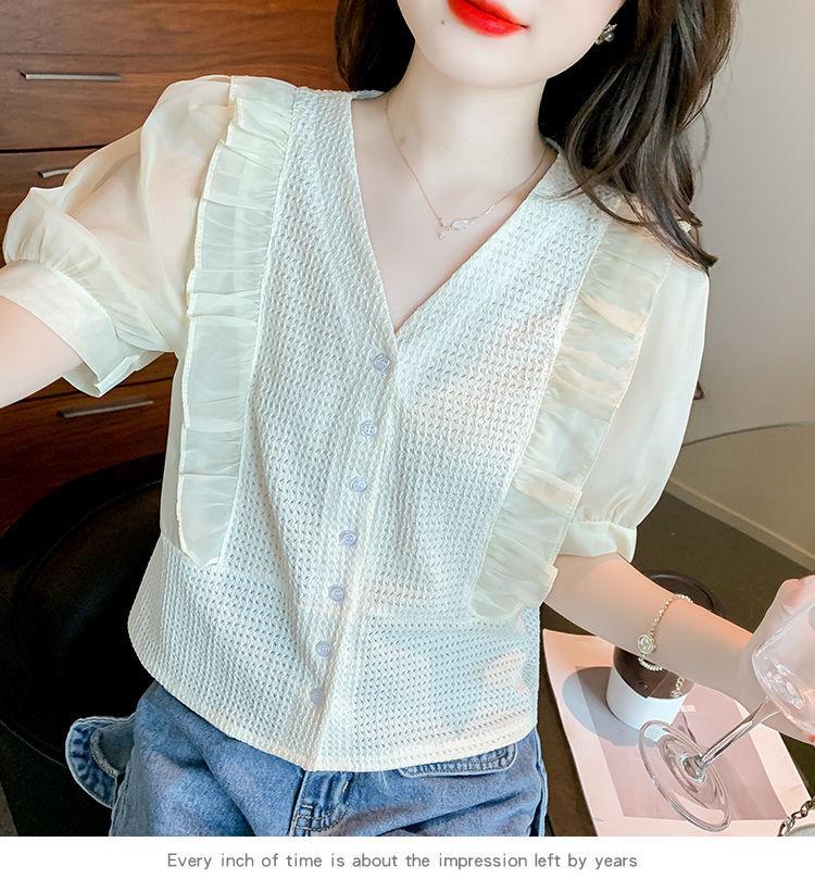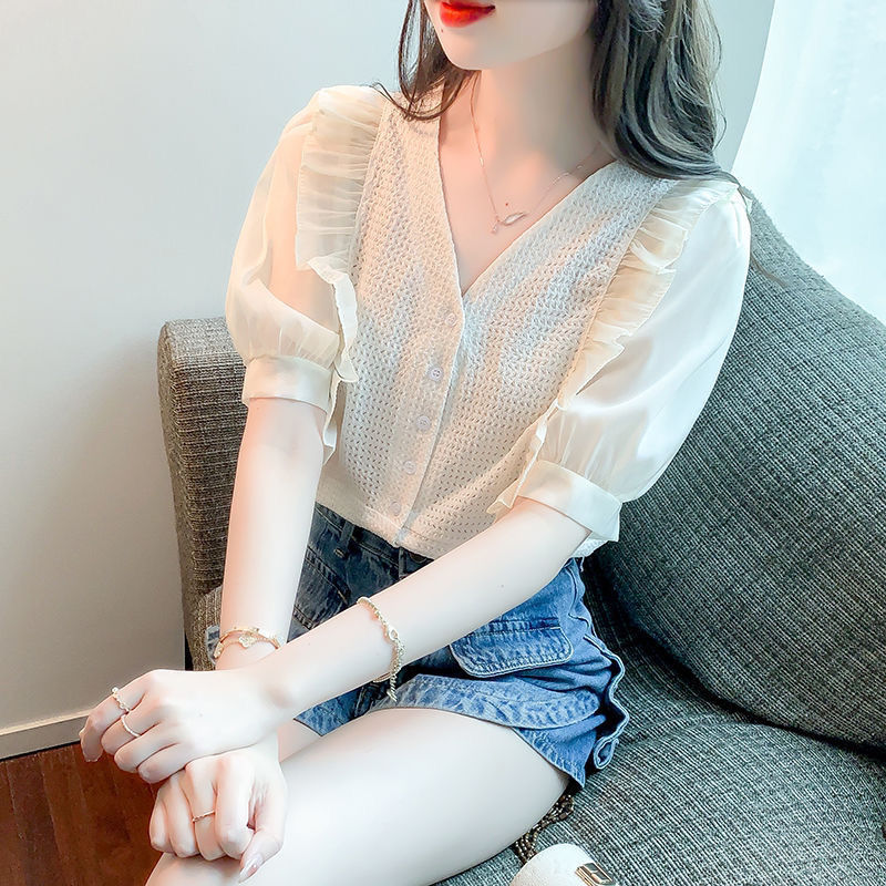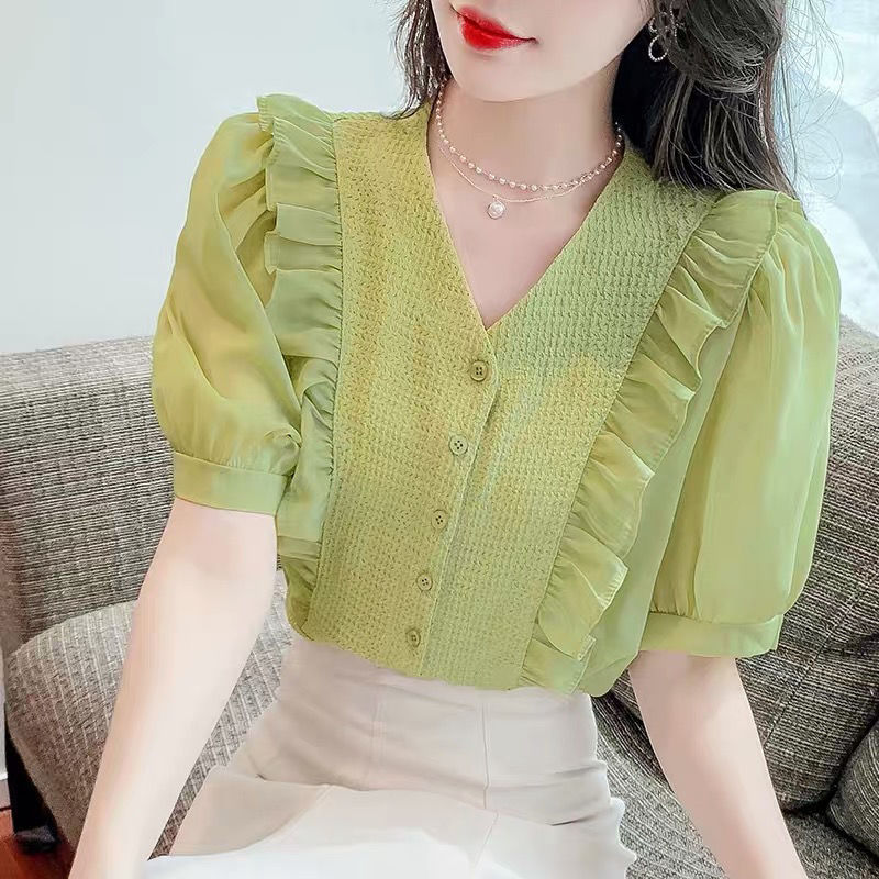슈퍼 페어리 러플 V-넥 셔츠 여성용 2022 여름 새로운 스타일 우아한 모든 매치 슬리밍 루즈한 퍼프 슬리브 쉬폰 탑스토어 가기