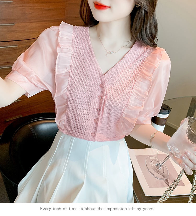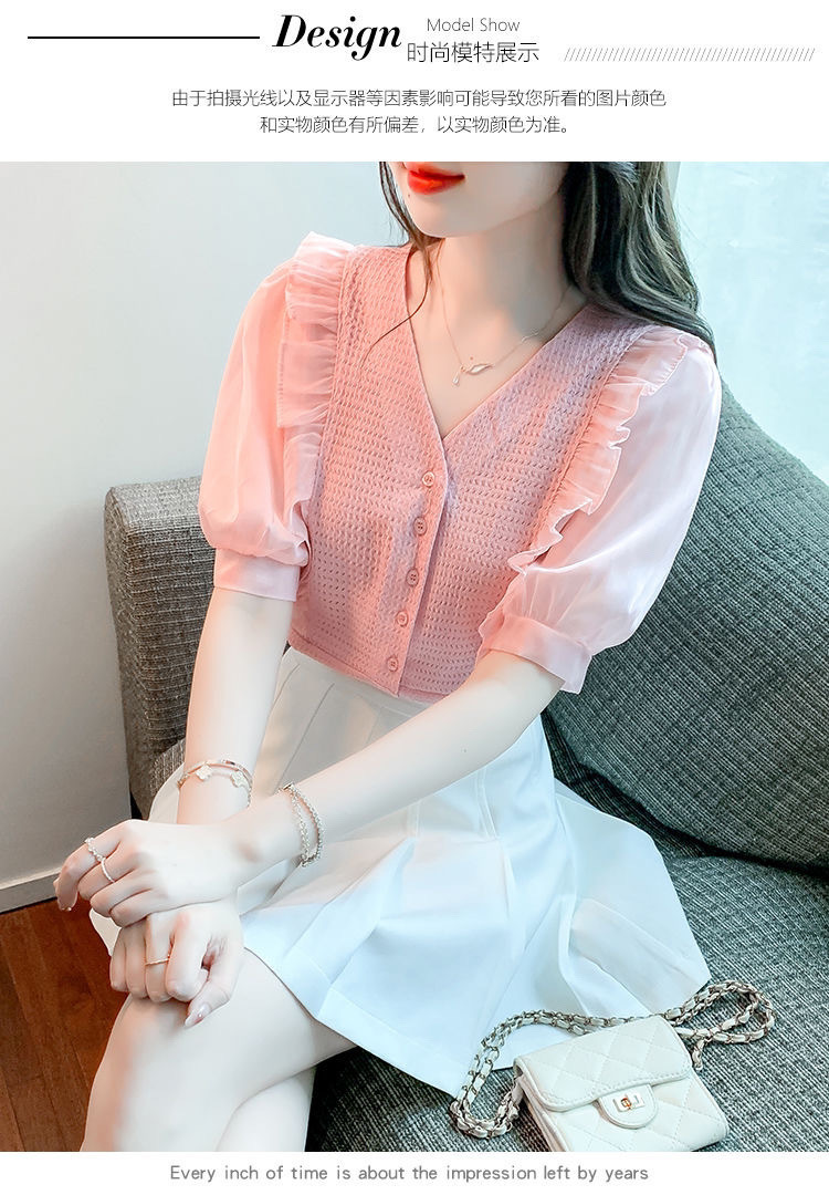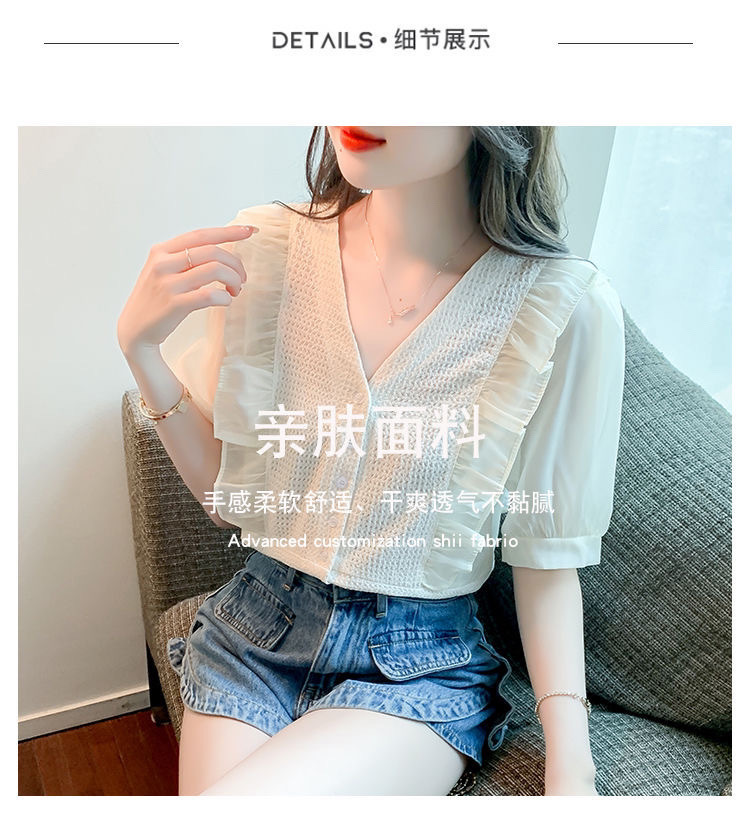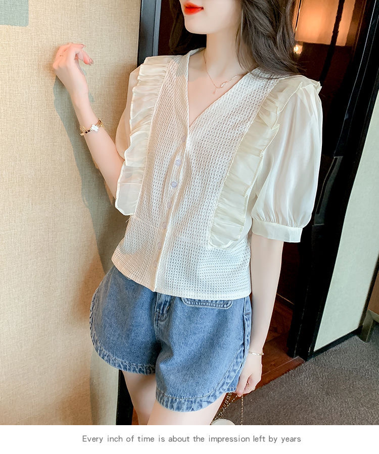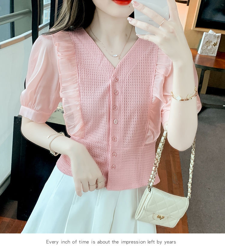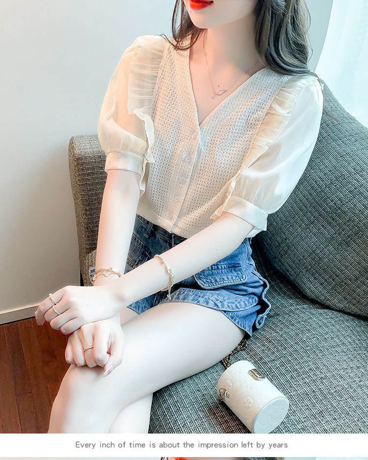 슈퍼 페어리 러플 V-넥 셔츠 여성용 2022 여름 새로운 스타일 우아한 모든 매치 슬리밍 루즈한 퍼프 슬리브 쉬폰 탑스토어 가기