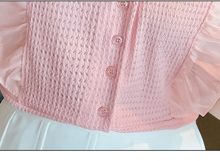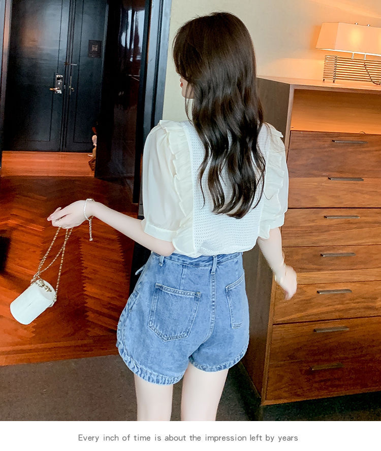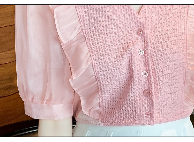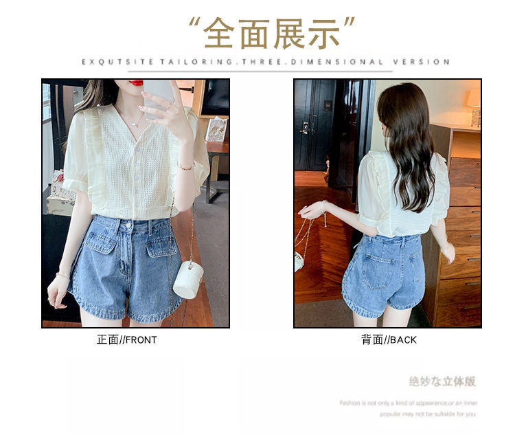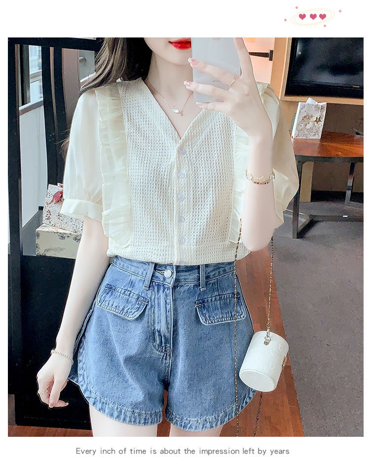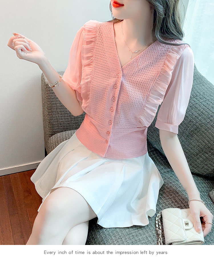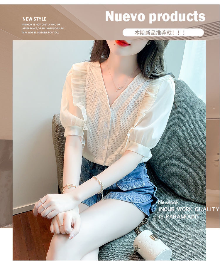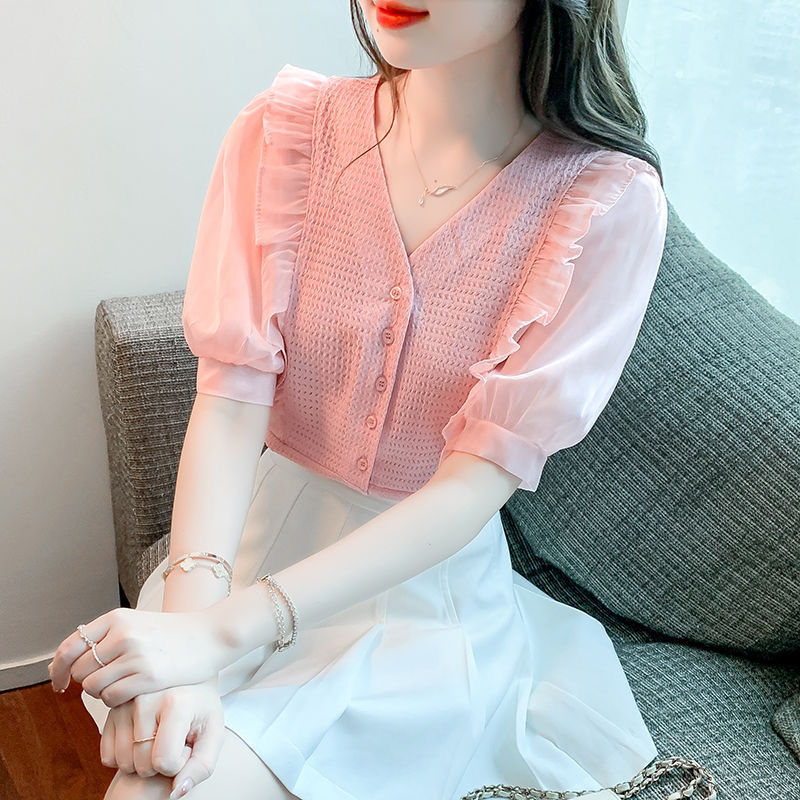 슈퍼 페어리 러플 V-넥 셔츠 여성용 2022 여름 새로운 스타일 우아한 모든 매치 슬리밍 루즈한 퍼프 슬리브 쉬폰 탑스토어 가기