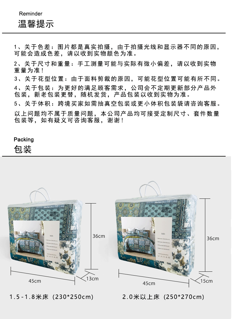 • 2.0 m 침대 세트 3 개: 침대 커버 250*270 + 50*70 + 5 베갯잇 2
