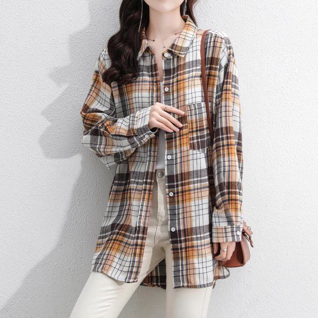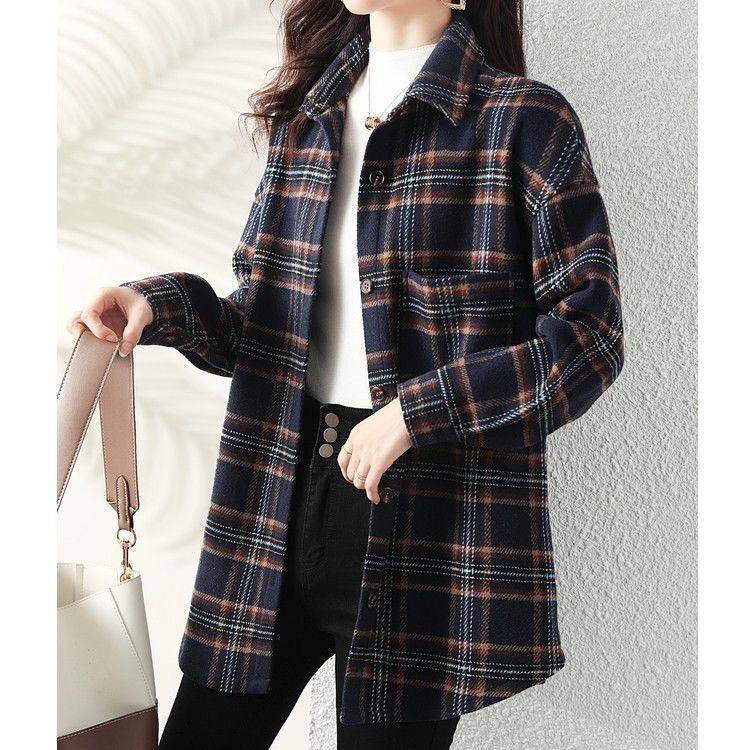 브러시 격자 무늬 셔츠 여성용 긴팔 한국식 루즈한 패셔너블한 올 매치 레트로 탑 중간 길이 봄과 가을 스택 재킷스토어 가기