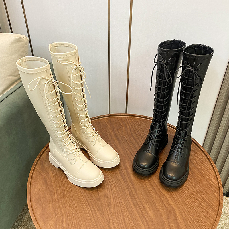 백 지퍼 부츠 여성용 가을 새 스타일 부츠 여성용 두꺼운 밑창 레이스업 가죽 부츠 여성용 32-43 사이즈 직접 판매스토어 가기