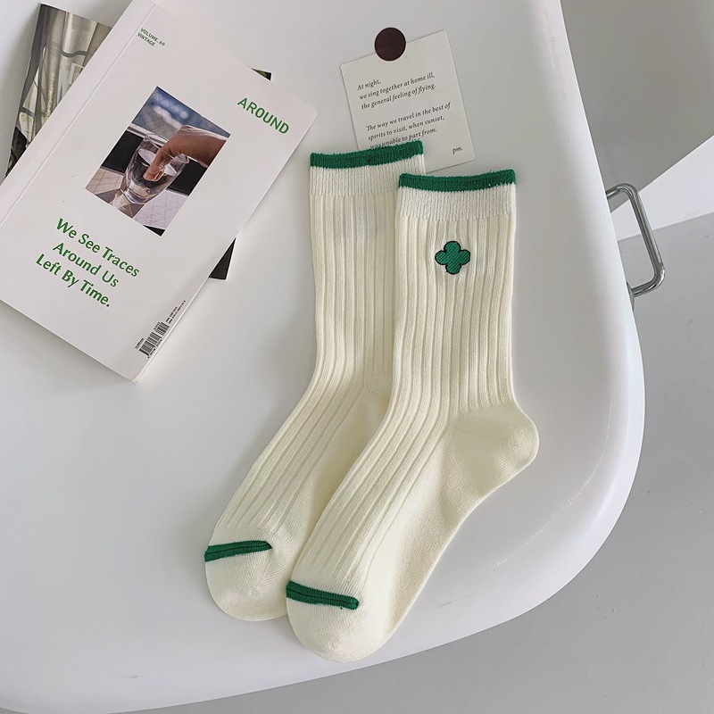 가을과 겨울 양말 도매 대나무 면 유행 클로버 자수 패션 중형 스타킹 어린이 일본 줄무늬 양말스토어 가기