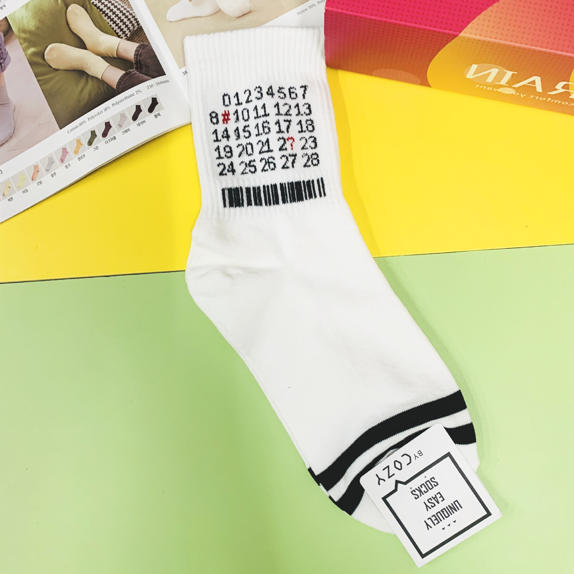 한국 동대문 2022 가을과 겨울 새로운 개인화 된 여성의 디지털 바코드 패턴 한국식 양말스토어 가기