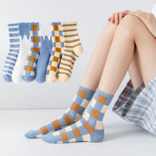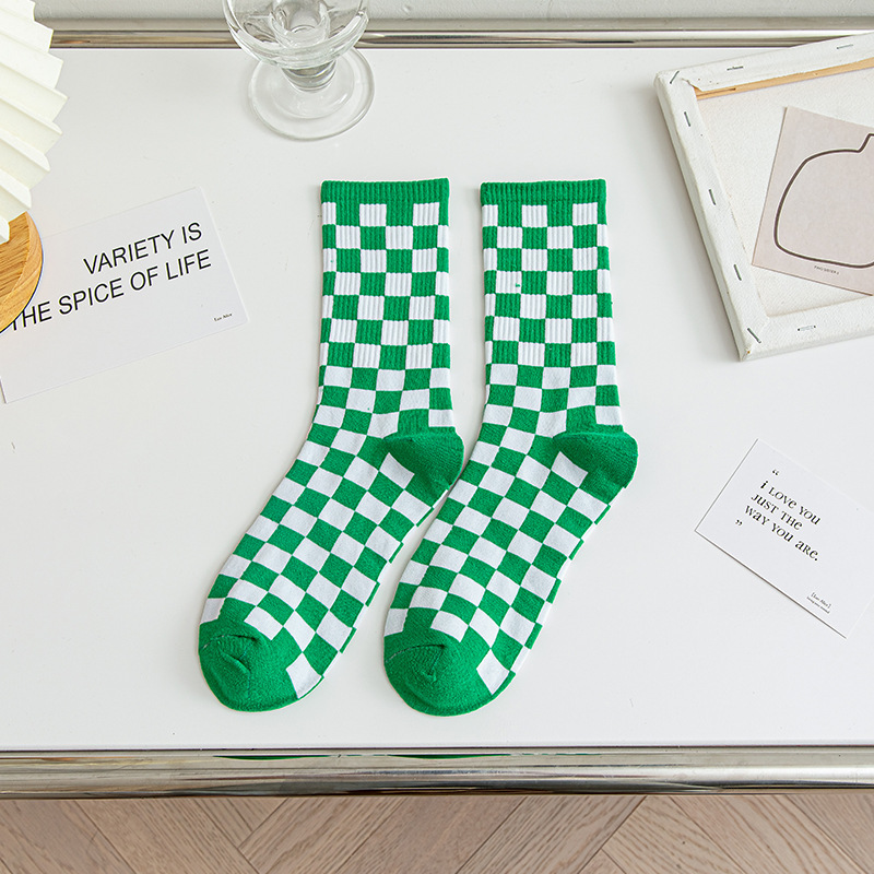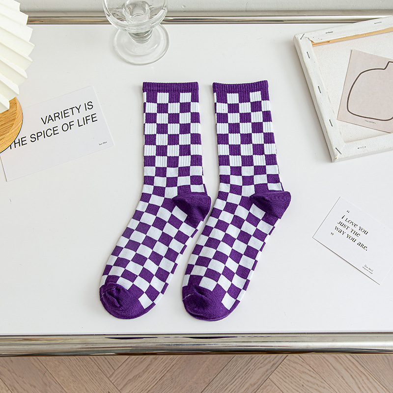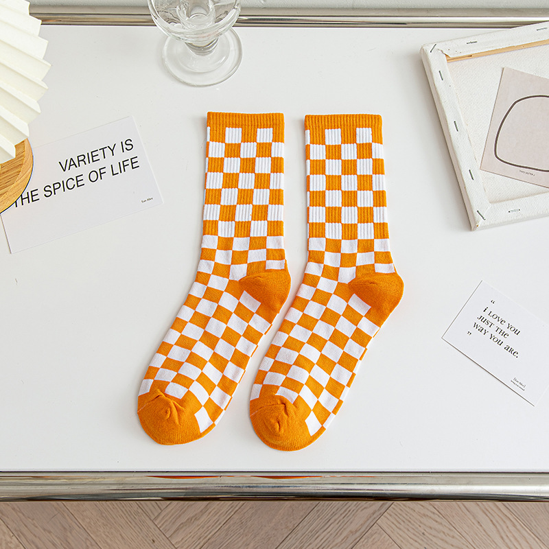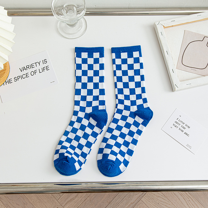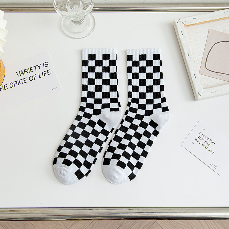 인터넷 인기 바둑판 중간 길이 양말 가을과 겨울 남성과 여성의면 양말 흑백 격자 무늬 일본의 유럽과 미국 유행 양말