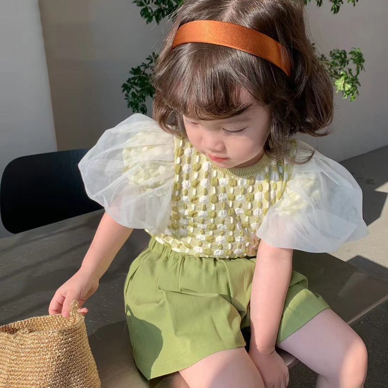 여아 반팔 세트 2022 여름 아동 한국 스타일 퍼프 소매 셔츠 반바지 투피스 세트 아동복 그린 세트
