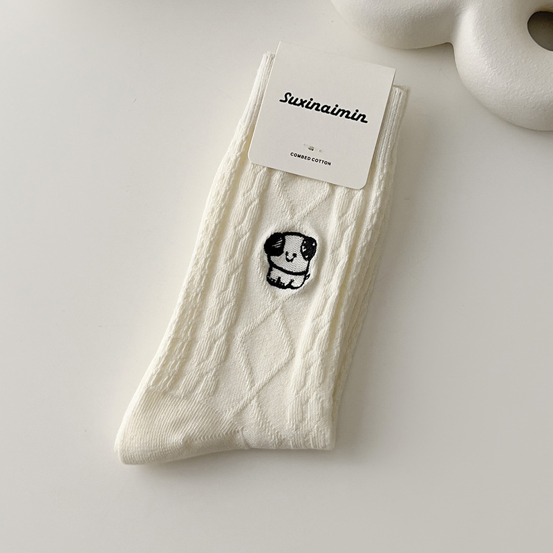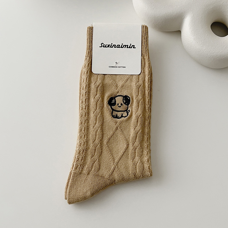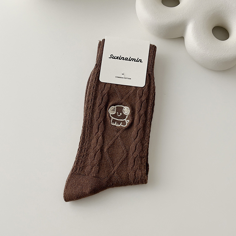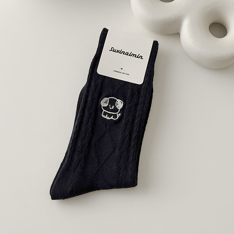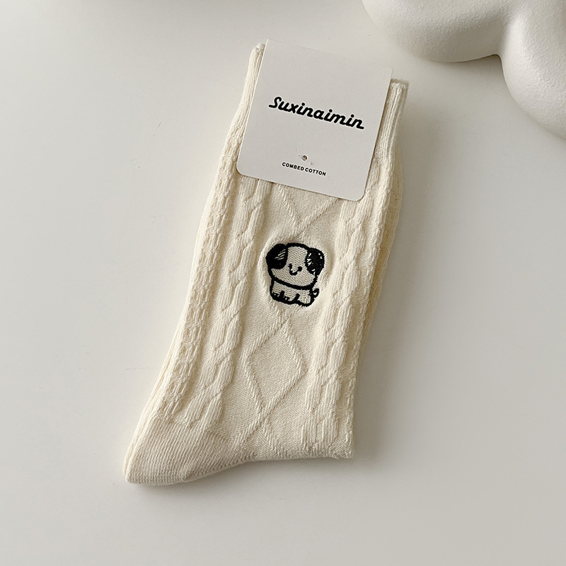 양말 여자의 가을과 겨울 자수 강아지 어린이와 학생을위한 귀여운 일본 빈티지 중간 길이 양말 단색 모든 일치 긴 양말