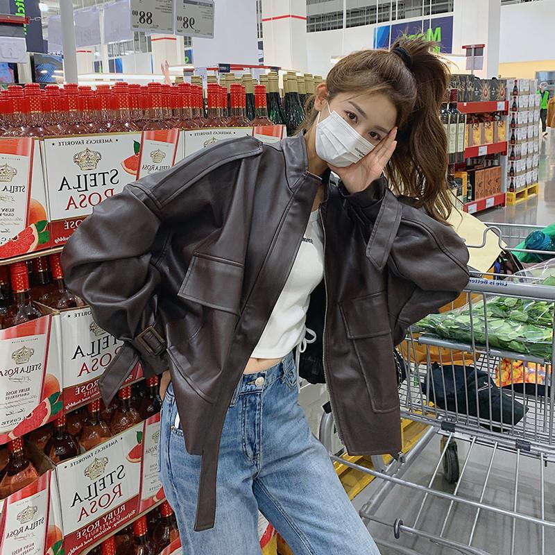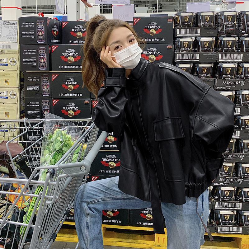 리얼 샷 작은 느슨한 세로 칼라 짧은 가죽 코트 오토바이 튀김 거리 느슨한 캐주얼 모든 매치 홍콩 스타일 재킷 여성용스토어 가기