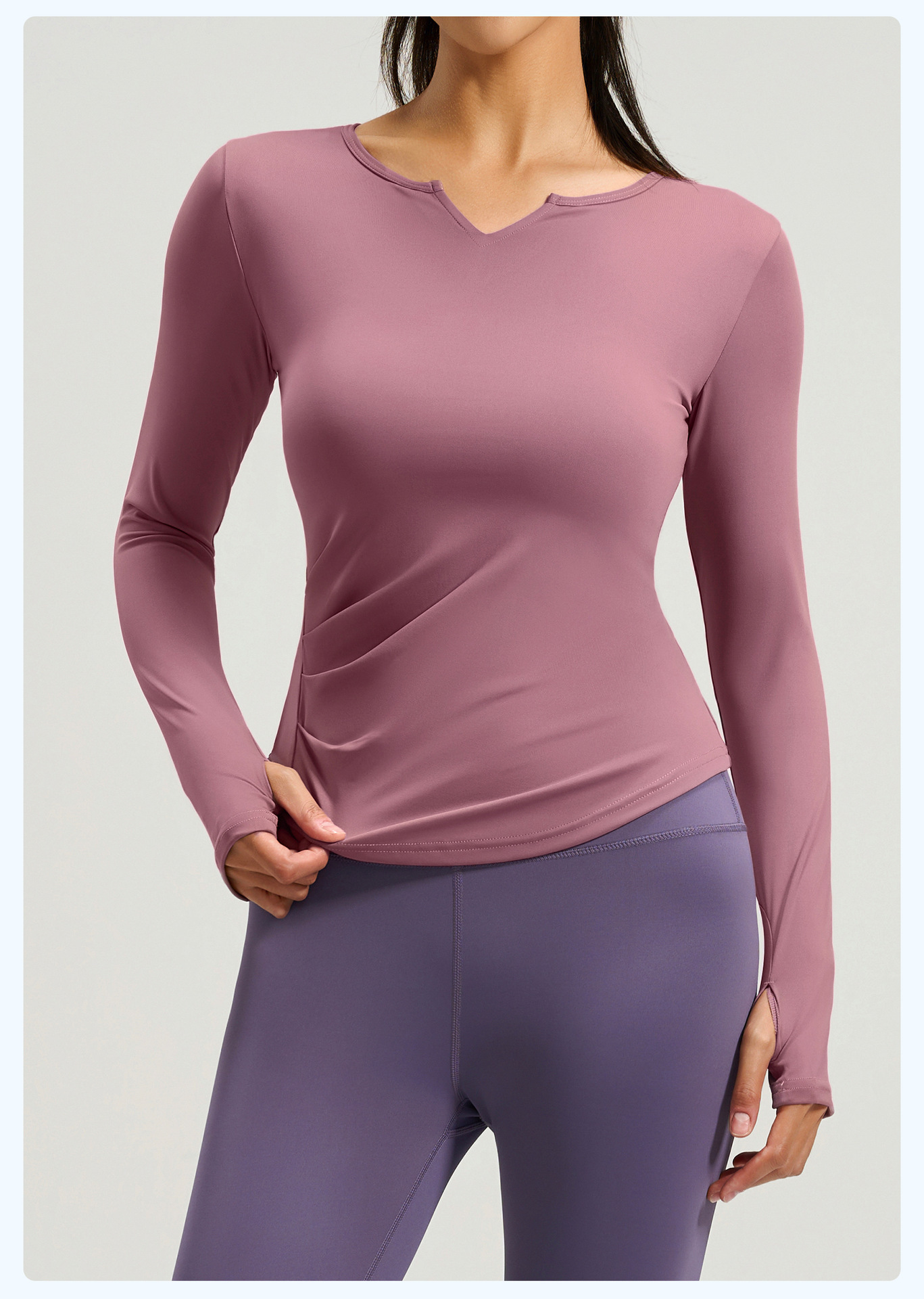 국경을 넘어 인기 있는 요가 긴팔 V넥 런닝 스포츠 탑 허리 주름 입체 슬림핏 피트니스 요가 티셔츠 여성용