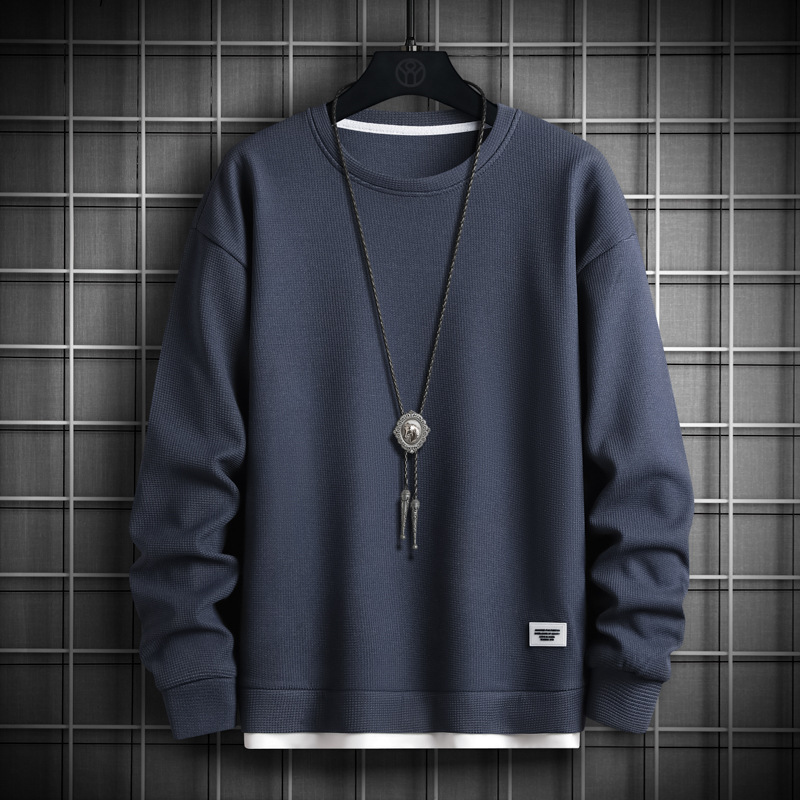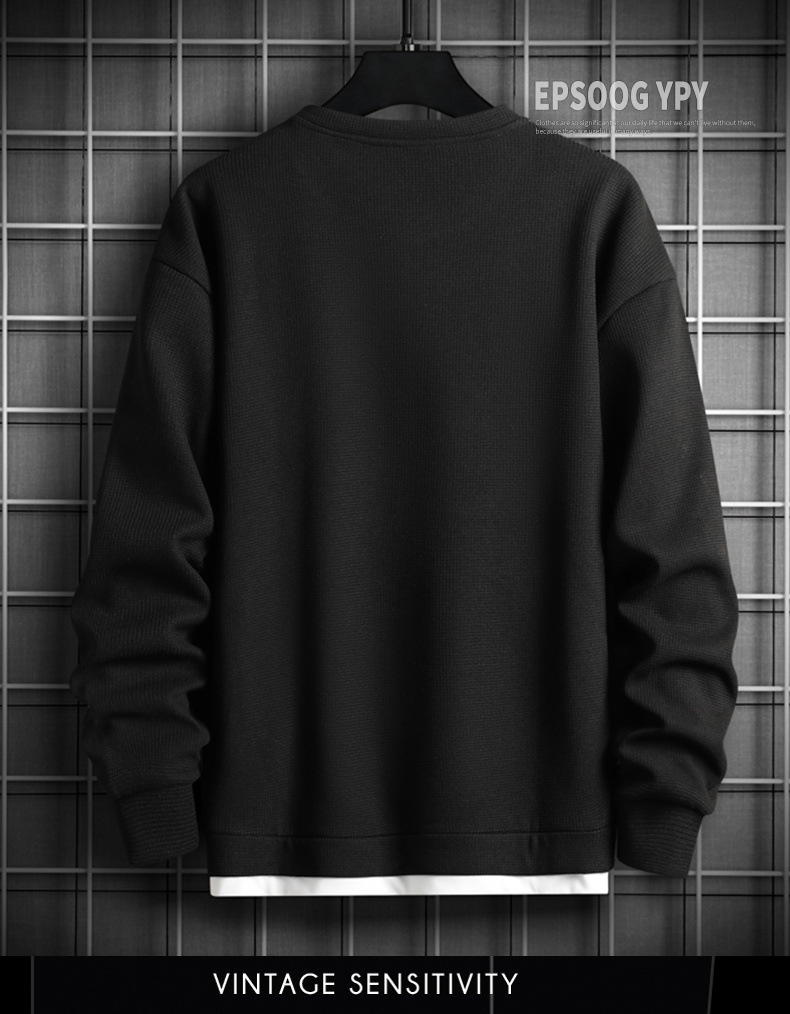 트렌디한 와플 패턴 투피스 스타일 남성용 가을 겨울 기모 라운드넥 루즈핏 긴팔 티셔츠 남성 캐주얼 이너웨어