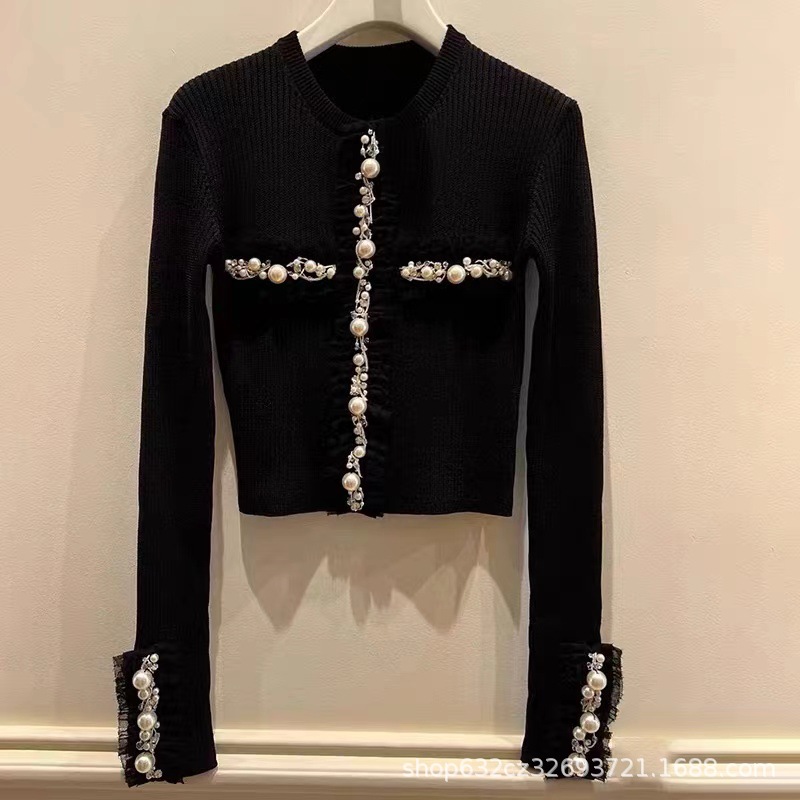 2025년 가을 여성을 위한 블랙 스몰 프래그런스 스타일 하이엔드 다이아몬드 니트 가디건 새로운 스타일 틈새 스웨터 탑