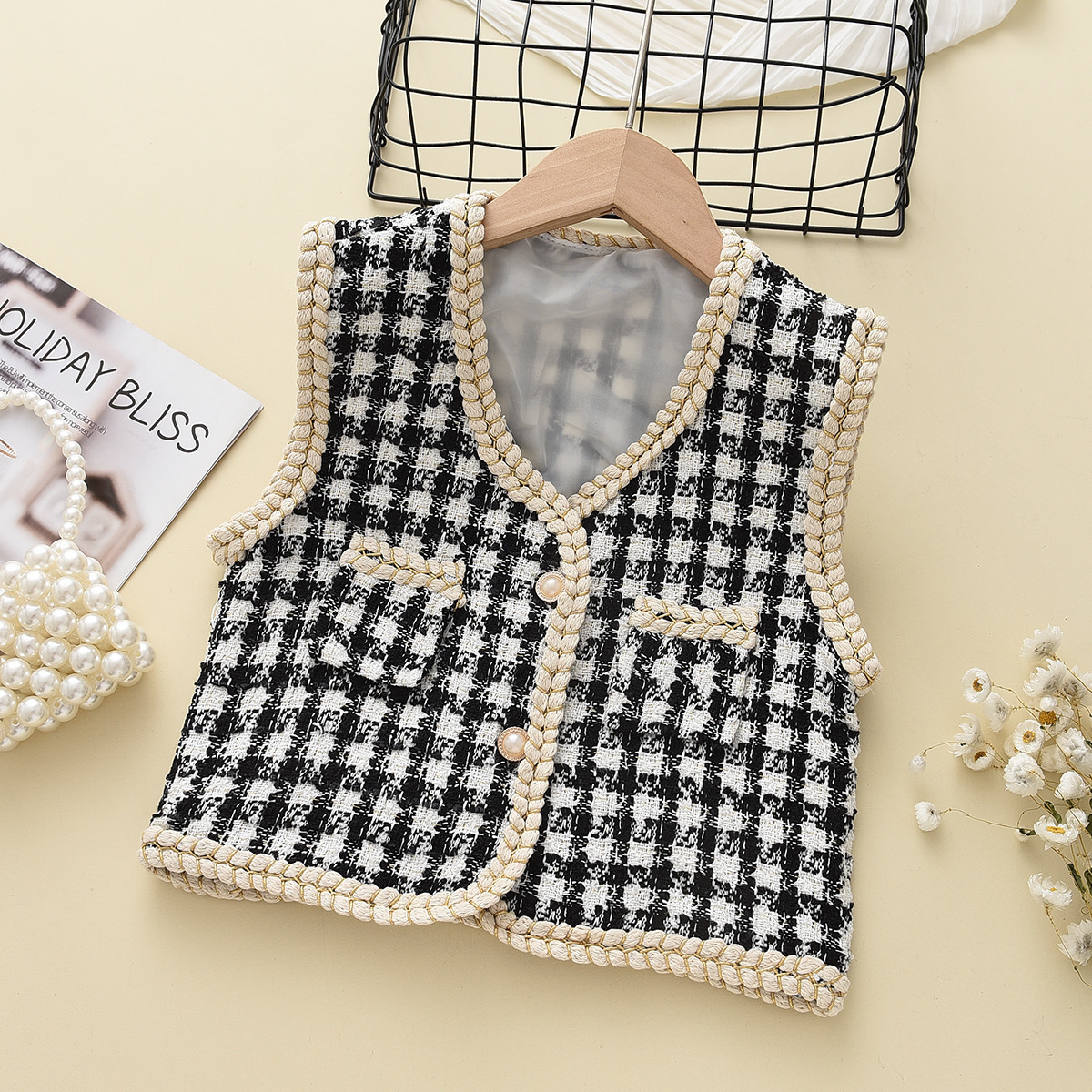77002 여아 사교계 스타일 격자 무늬 웨스턴 스타일 조끼 코트 봄과 가을 스타일 어린이 웨스턴 스타일 조끼
