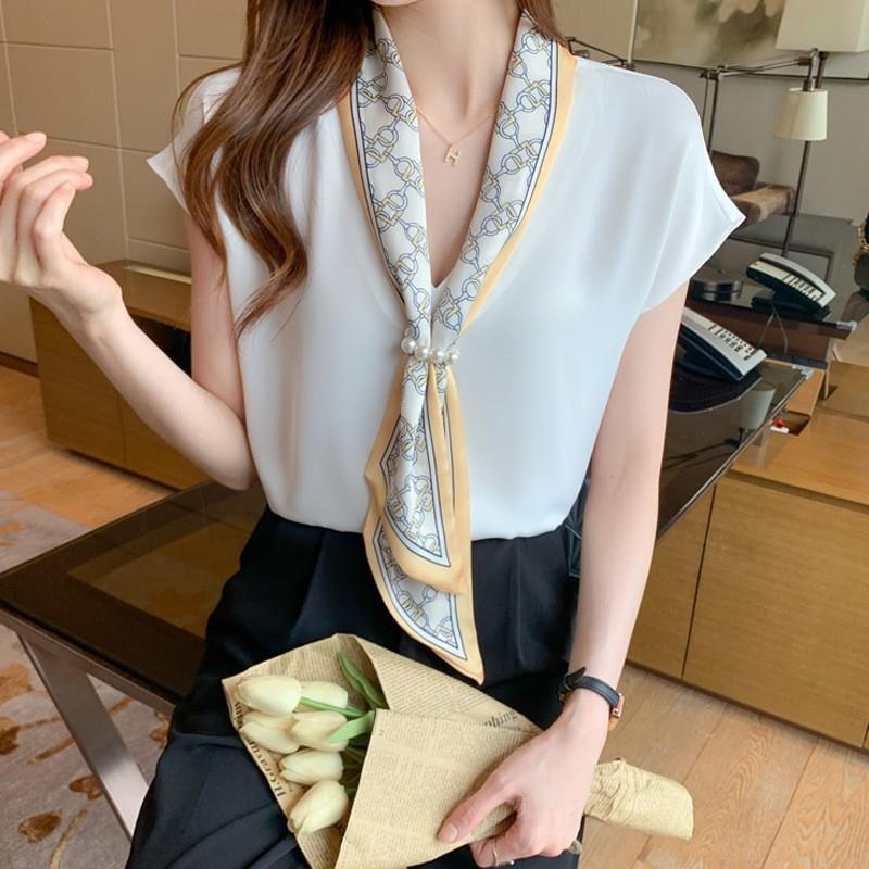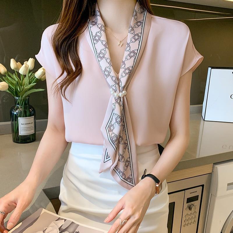 기질 나비 넥타이 부드러운 V 넥 셔츠 여성 여름 새로운 디자인 반팔 패션 다목적 바닥 셔츠 유행 탑스토어 가기