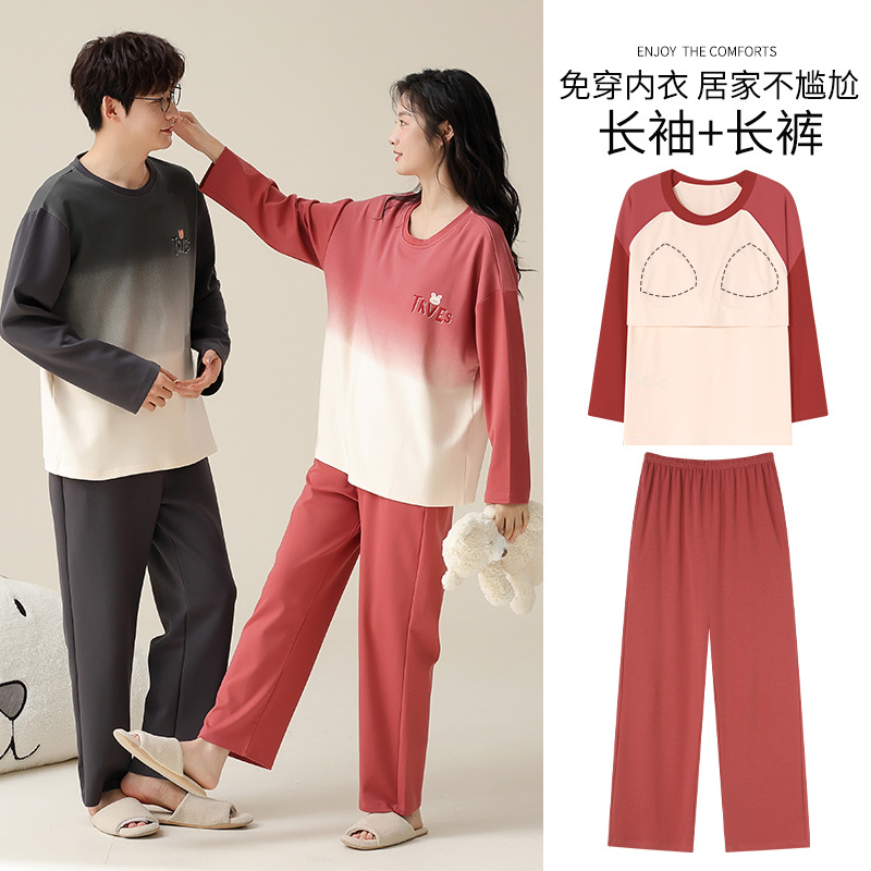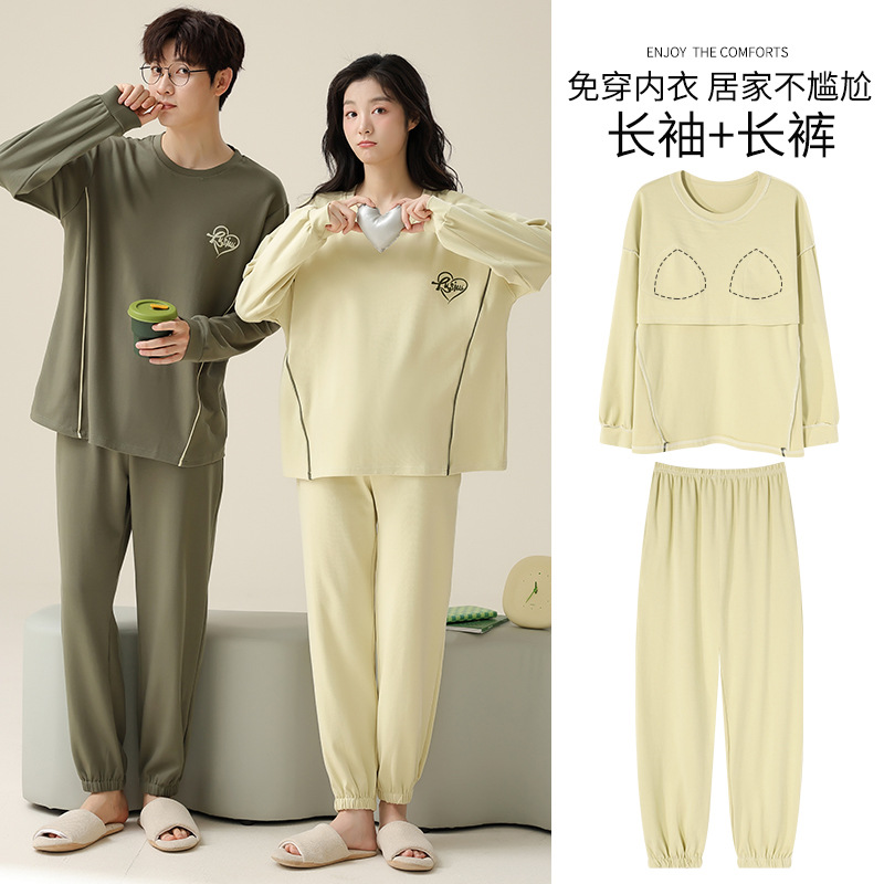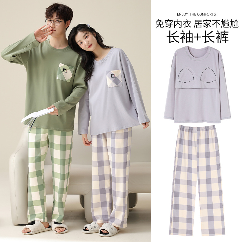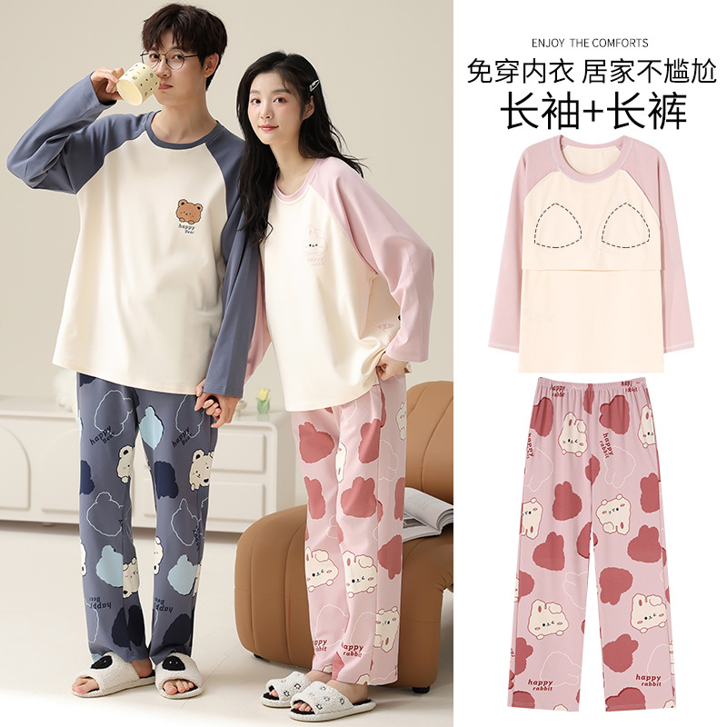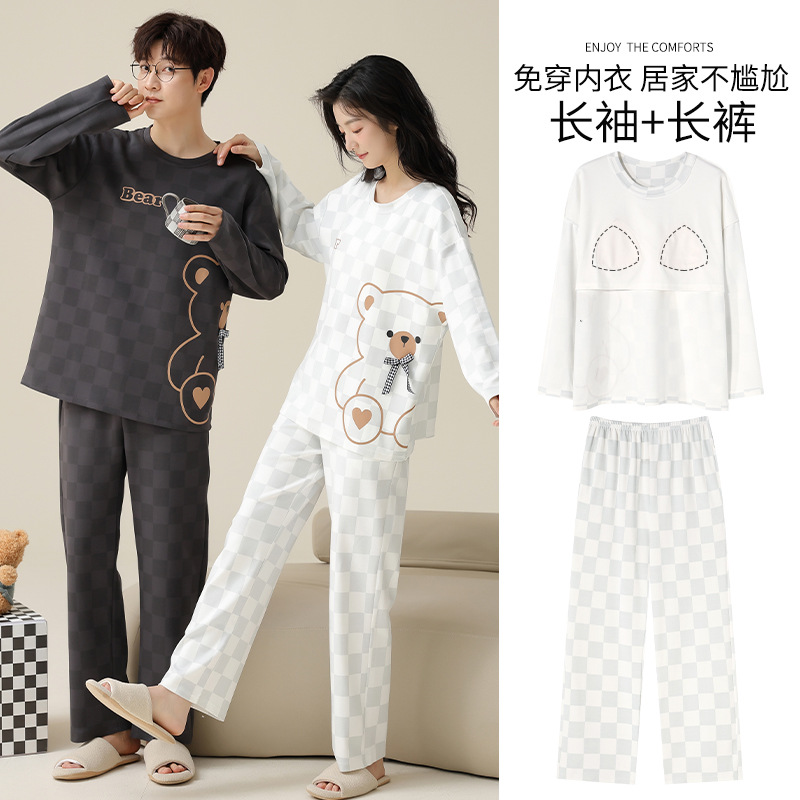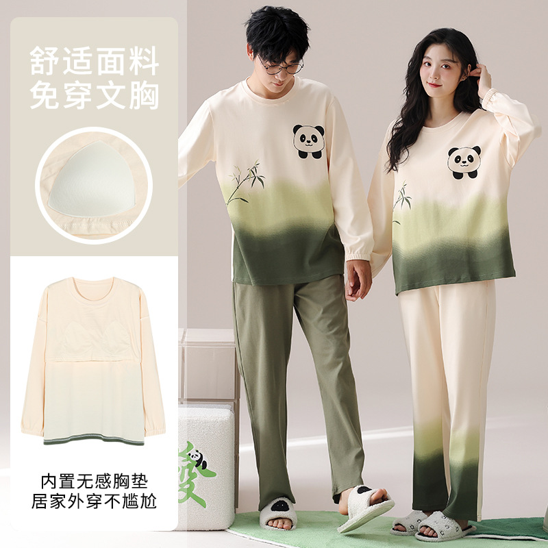 가슴 패드가 있는 커플 잠옷, 봄과 가을용 순면 긴팔 만화 팬더 남녀 공용 실내복 세트스토어 가기