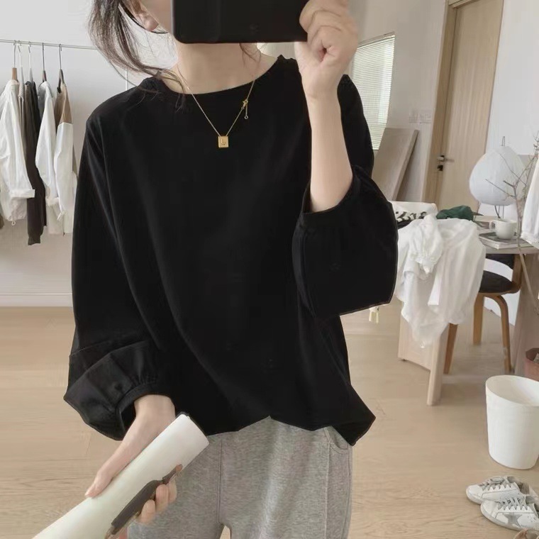 가을 새로운 느슨한 플러스 사이즈 슬리밍 라운드 넥 9 분기 슬리브 면화 간단한 연령 감소 탑 7644