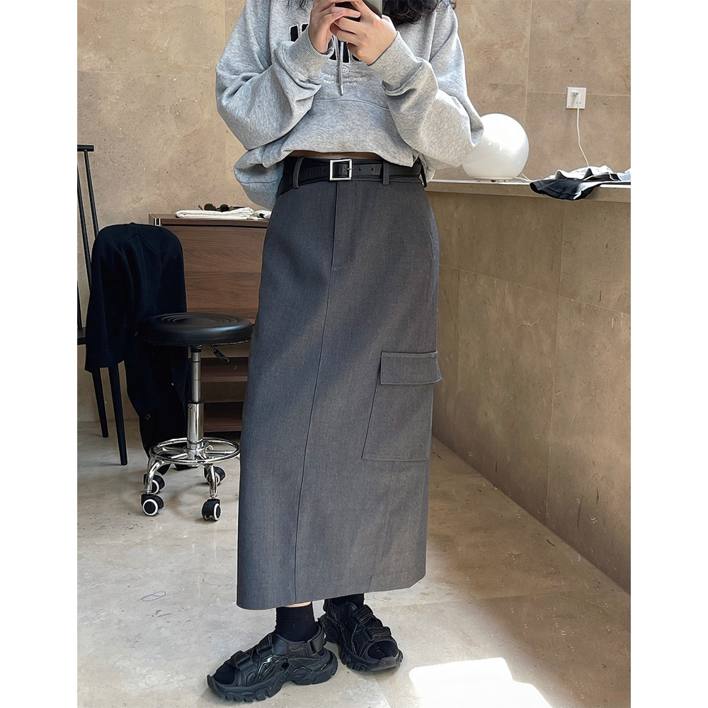 이른 봄 새로운 한국 스타일 툴링 유행 포켓 스커트 여성용 스트레이트 롱 와이드 세로 리어 스플릿 롱 스커트스토어 가기