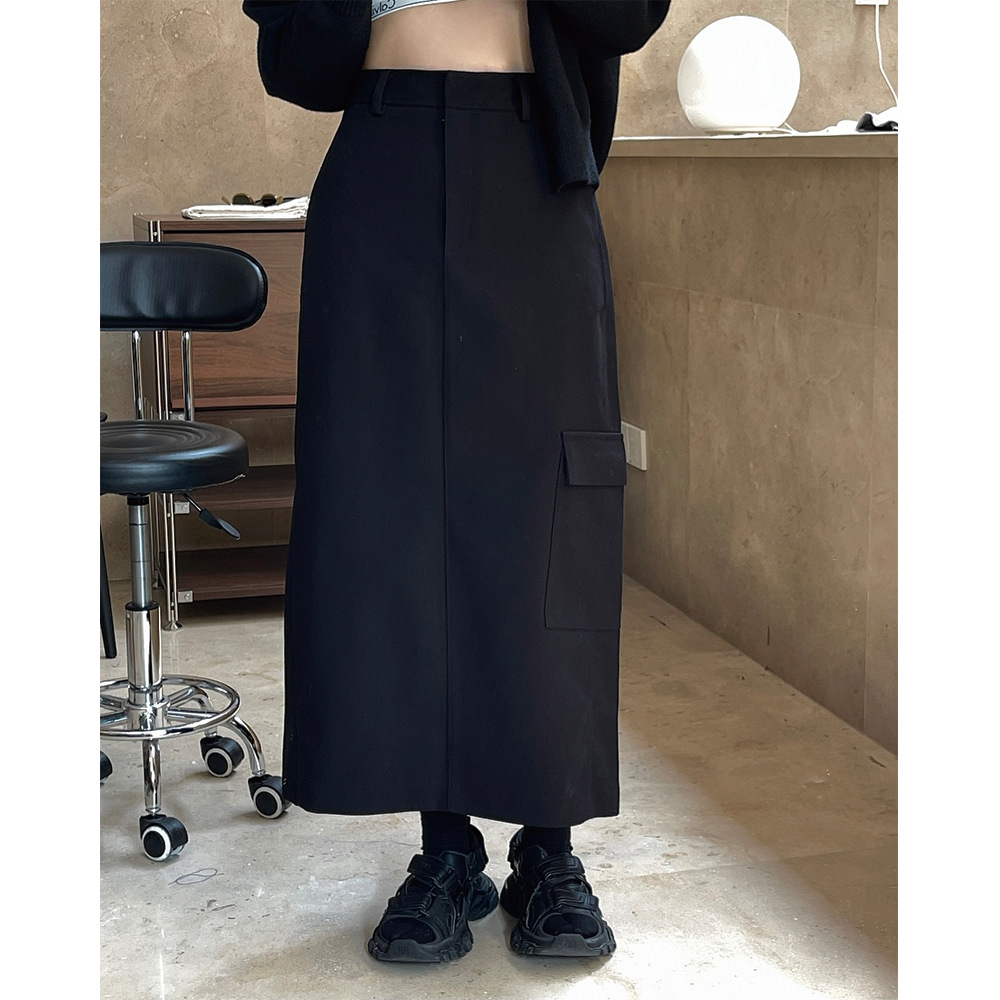 이른 봄 새로운 한국 스타일 툴링 유행 포켓 스커트 여성용 스트레이트 롱 와이드 세로 리어 스플릿 롱 스커트