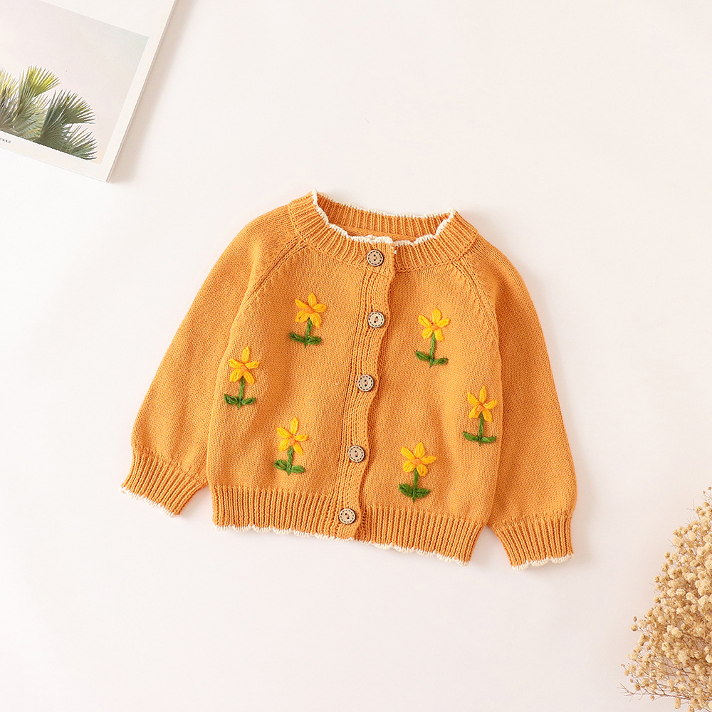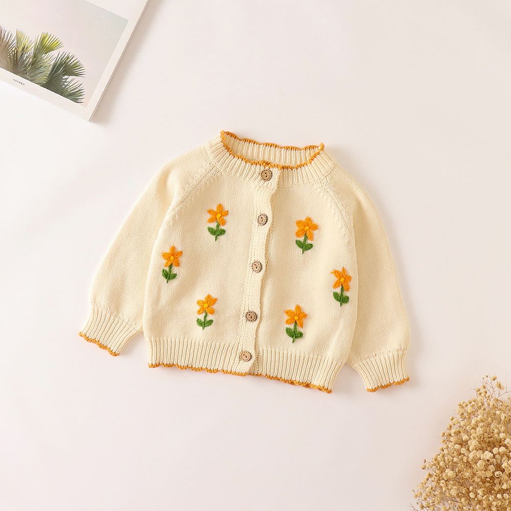 2025 가을 옷 아기 소녀 유아 아동 코트 손으로 수 놓은 꽃 니트 스웨터 면사 긴팔 카디건
