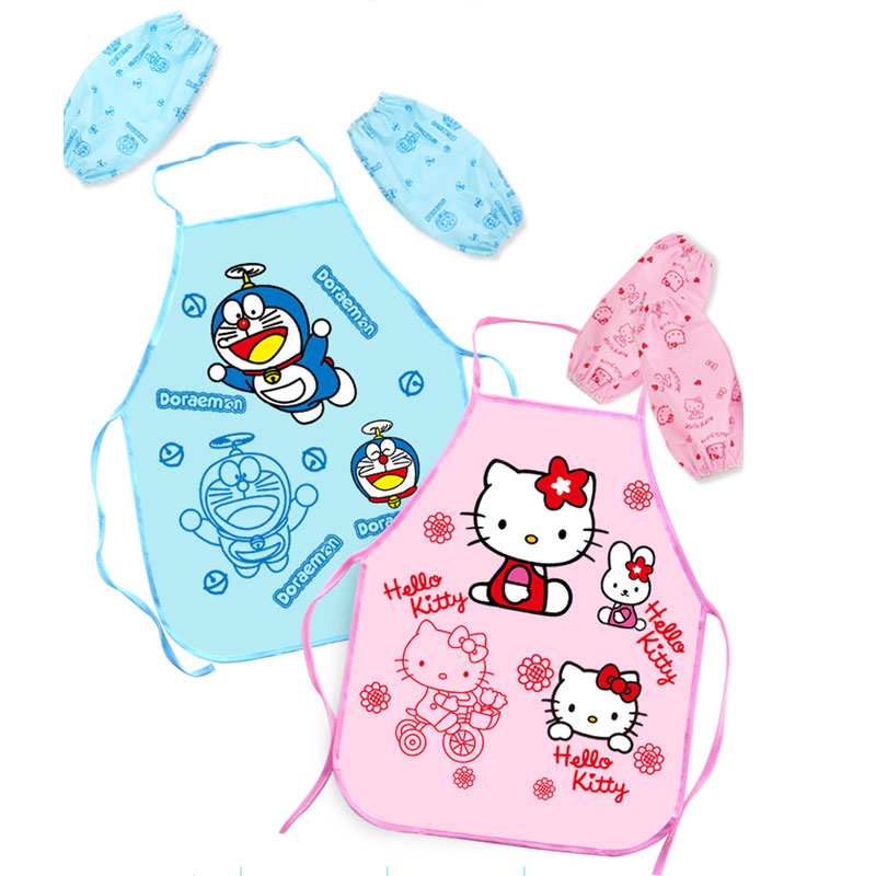 만화 헬로 키티 귀여운 어린이 앞치마 여자의 방수 유치원 그림 옷 커버 세트 소매와 소년과 아기를위한 옷