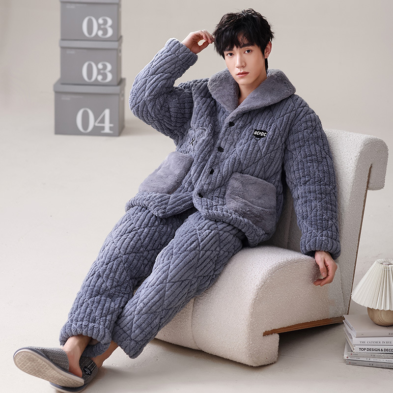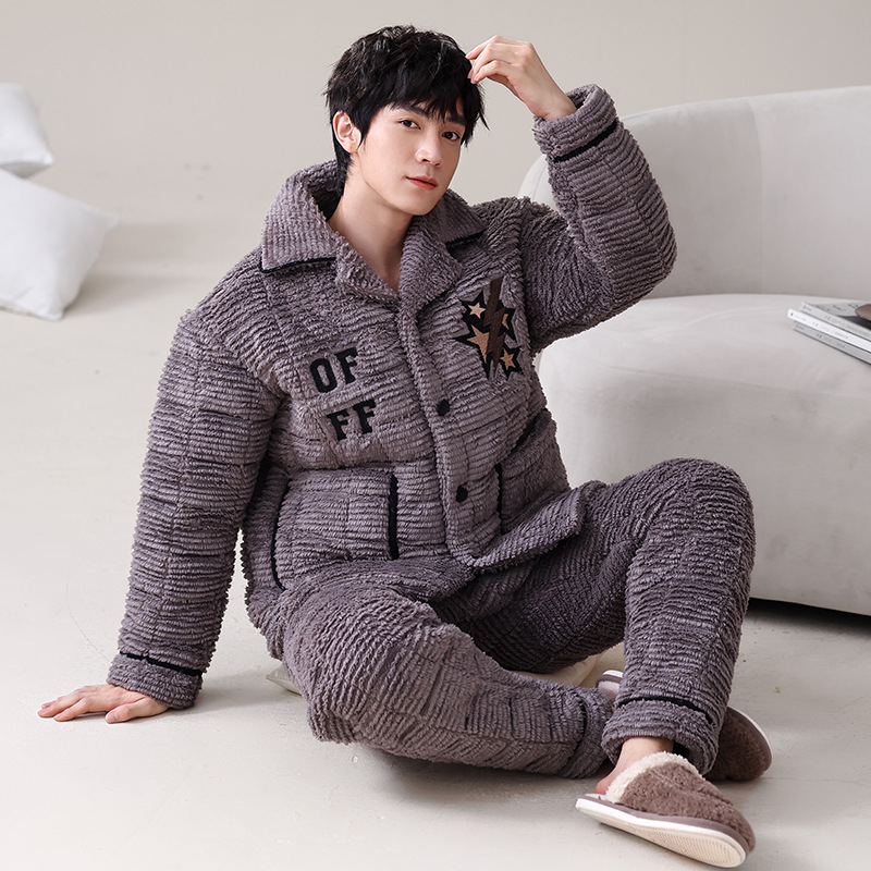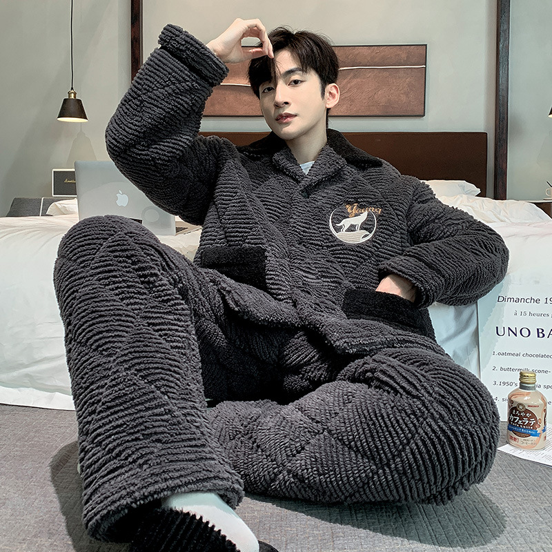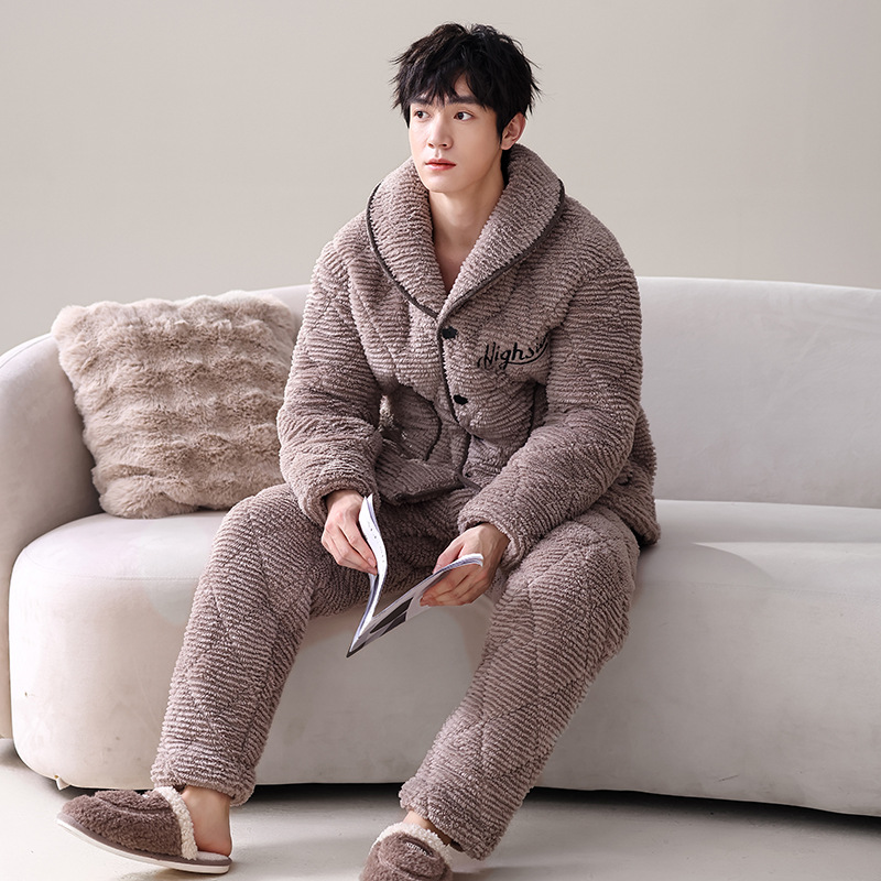 남자의 잠옷 산호 양털 가을과 겨울 3 층 면 두꺼운 따뜻한 기모 플란넬 청소년 가정 의류 세트
