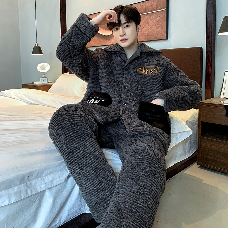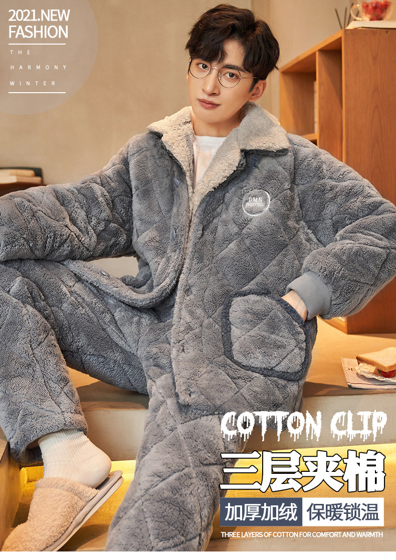 남자의 잠옷 산호 양털 가을과 겨울 3 층 면 두꺼운 따뜻한 기모 플란넬 청소년 가정 의류 세트스토어 가기