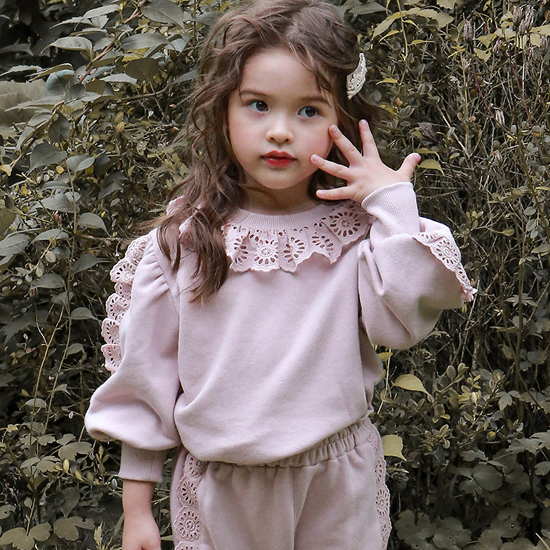 2025 가을 딸기 샌드라 한국 아동복 여아용 세련된 레이스 루즈핏 풀오버 긴팔 스웨트셔츠 재고 있음스토어 가기