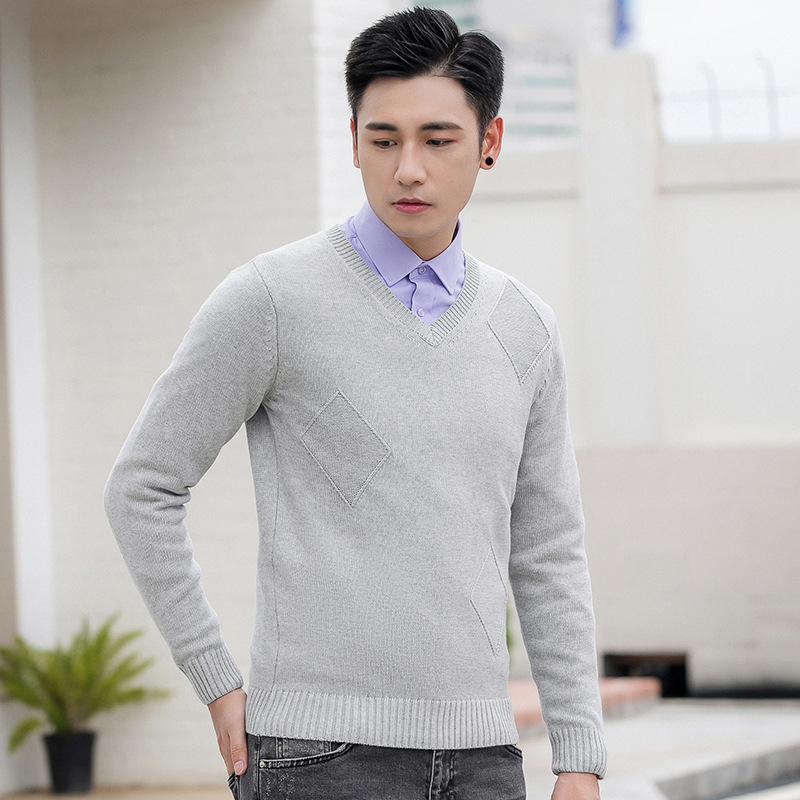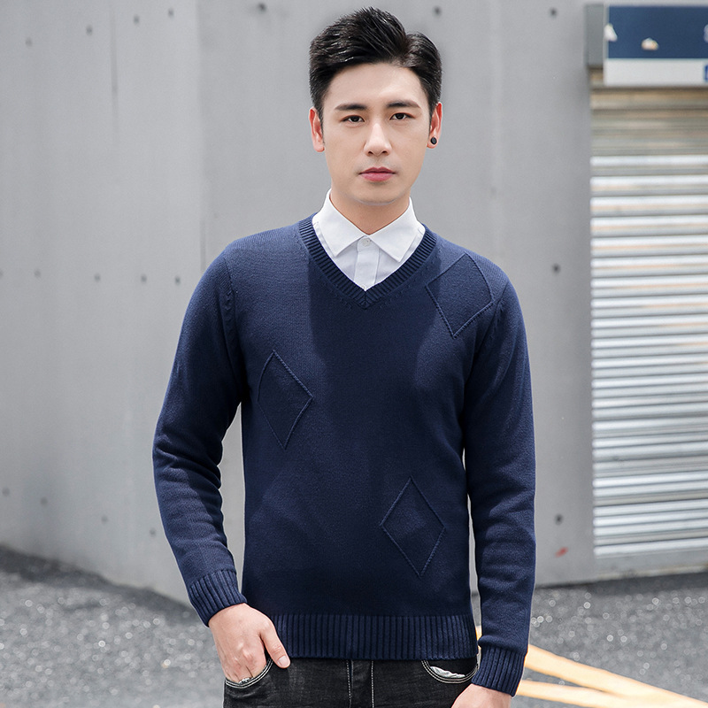 가을과 겨울 V-넥 풀오버 베이스 스웨터 한국식 청소년 남성용 단색 니트 스웨터 다이아몬드 자카드 긴팔 스웨터