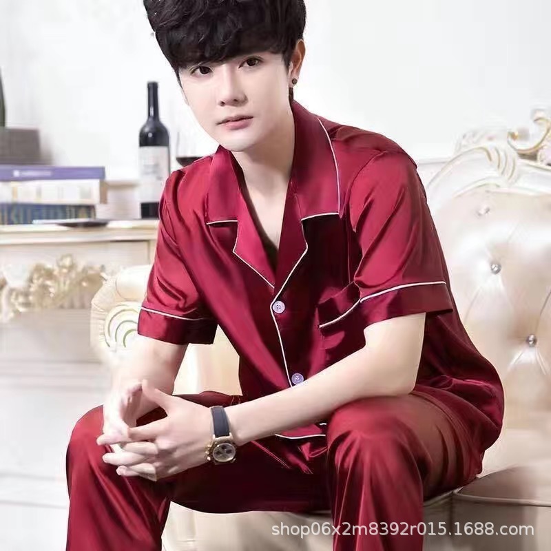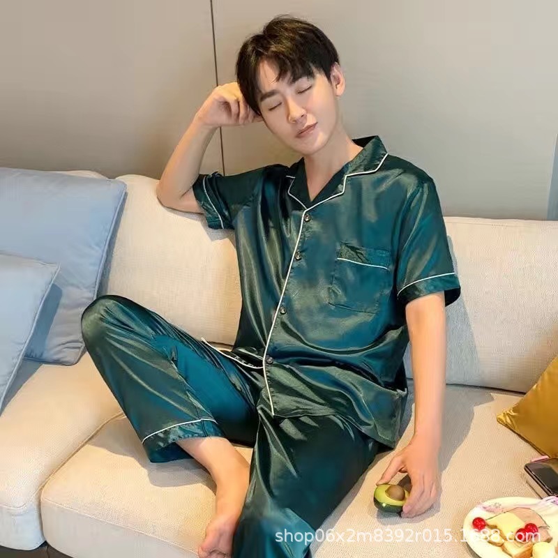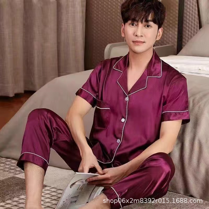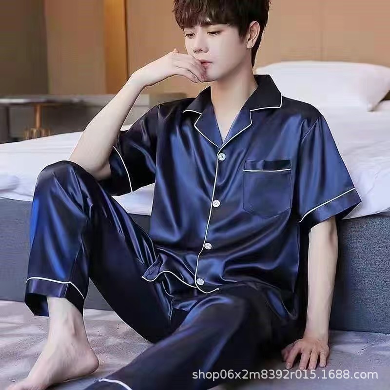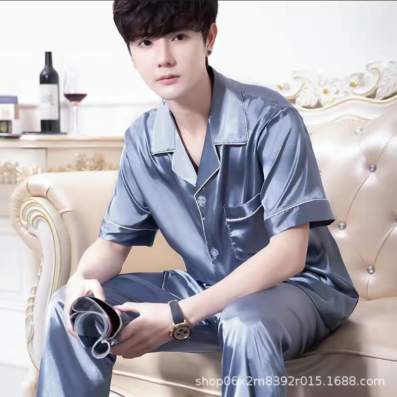아이스 실크 잠옷 남자의 여름 얇은 실크 남자의 반팔 바지 간단한 캐주얼 가정 의류 세트 봄과 가을스토어 가기