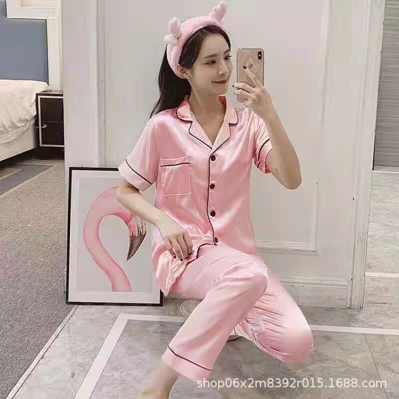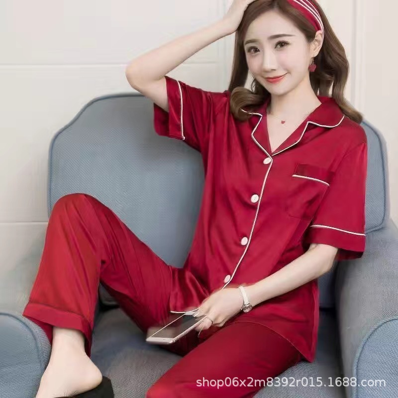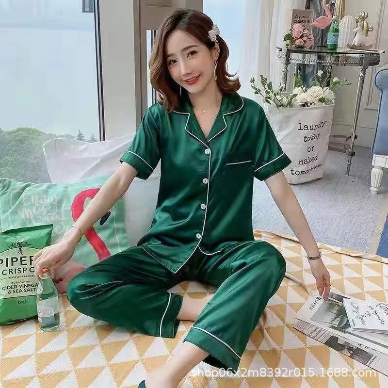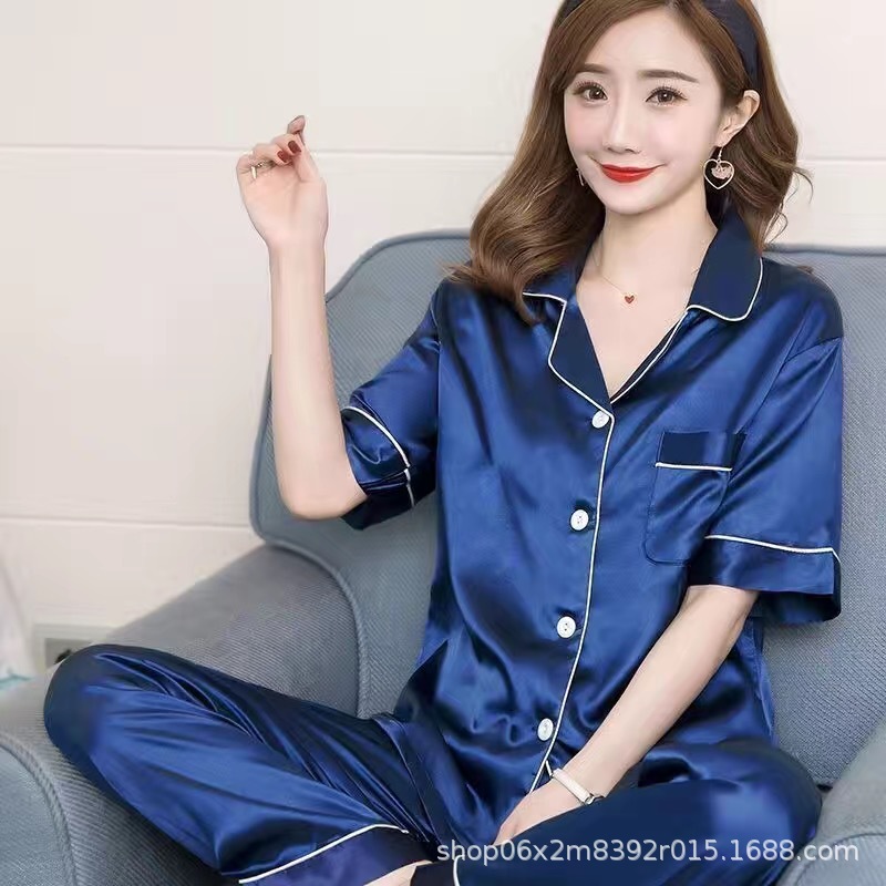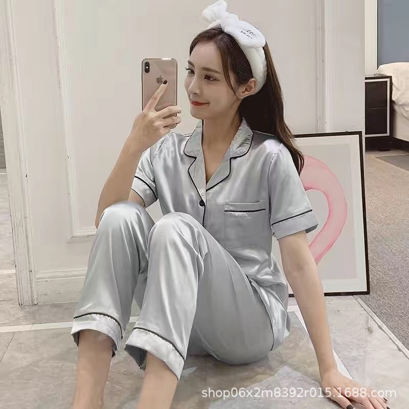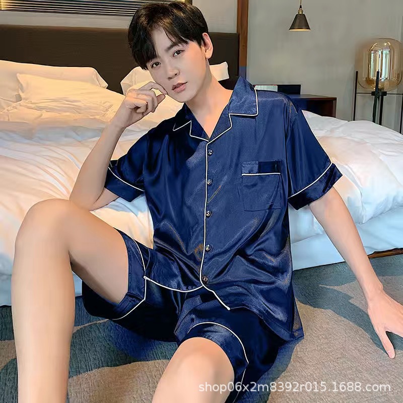 아이스 실크 잠옷 남자의 여름 얇은 실크 남자의 반팔 바지 간단한 캐주얼 가정 의류 세트 봄과 가을스토어 가기