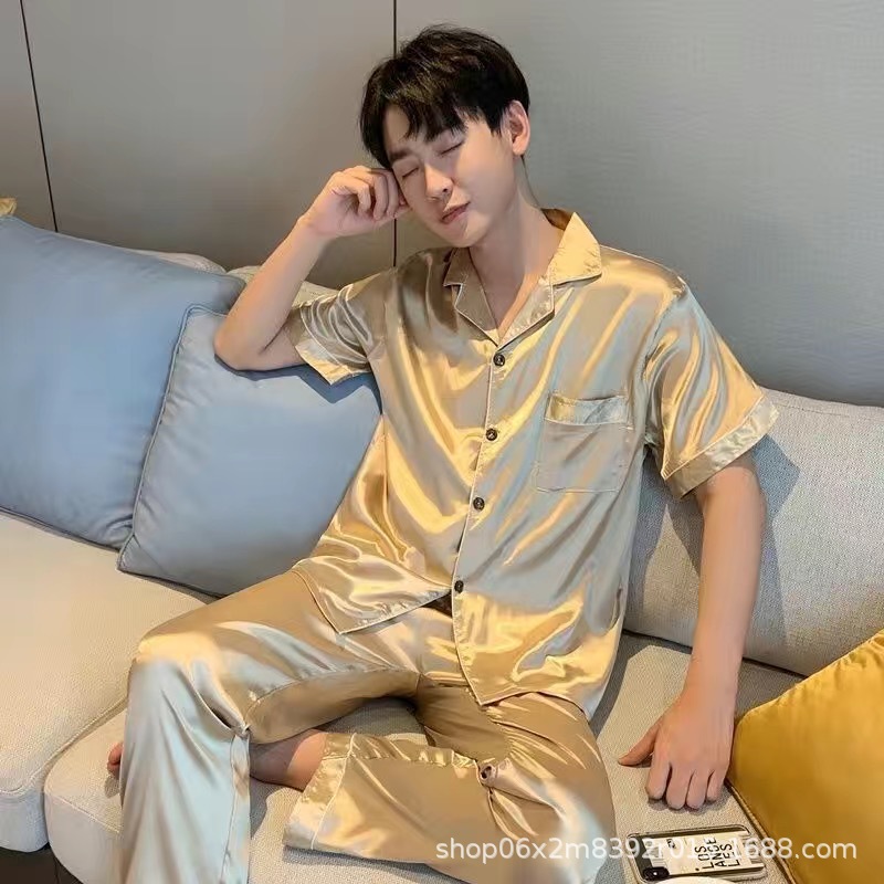 아이스 실크 잠옷 남자의 여름 얇은 실크 남자의 반팔 바지 간단한 캐주얼 가정 의류 세트 봄과 가을