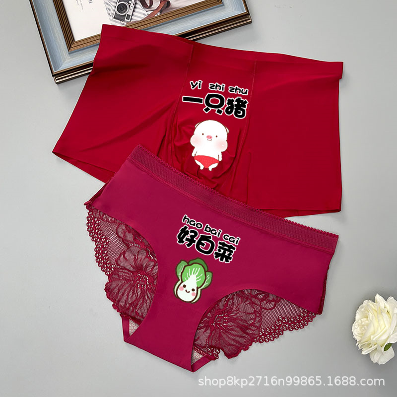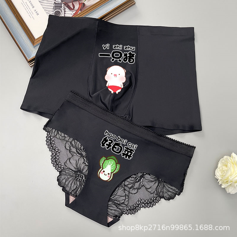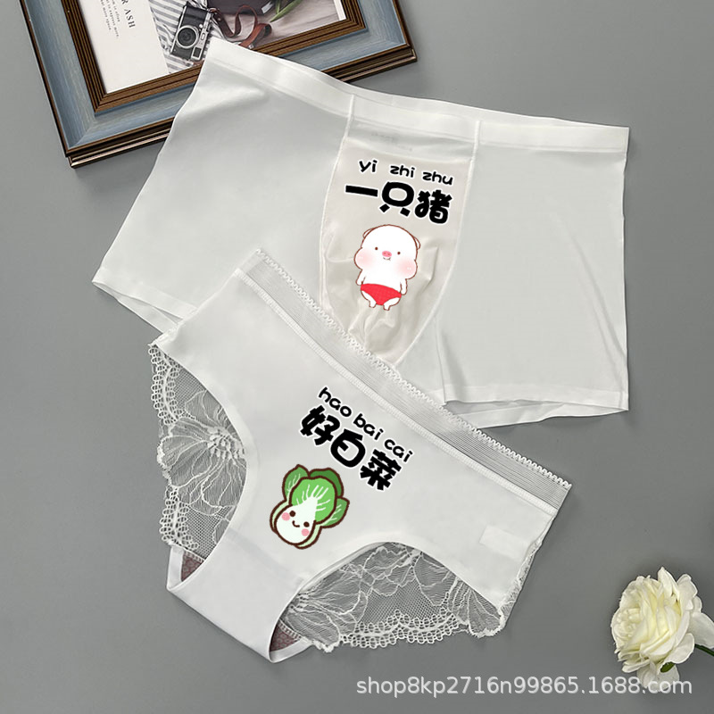 커플의 속옷 한 남자와 한 여자 여름 얇은 얼음 실크 원활한 섹시 레이스 속옷 세트 귀여운 만화 쌍
