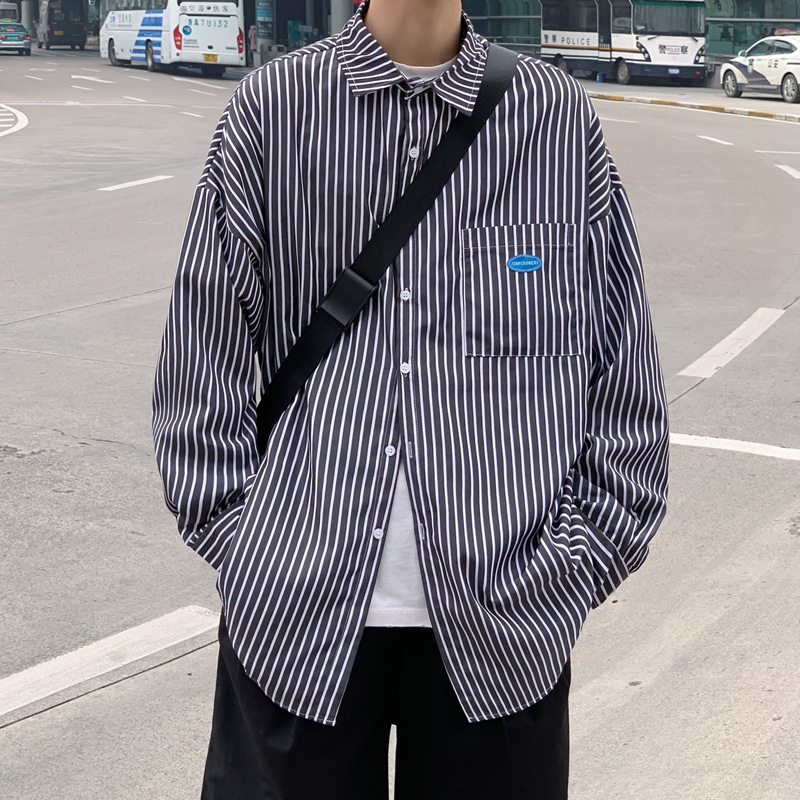 스트라이프 긴팔 셔츠 남자의 가을 고급 느낌 Ruffian 잘 생긴 유행 코트 홍콩 스타일 일본식 여피 남자 친구 스타일 셔츠