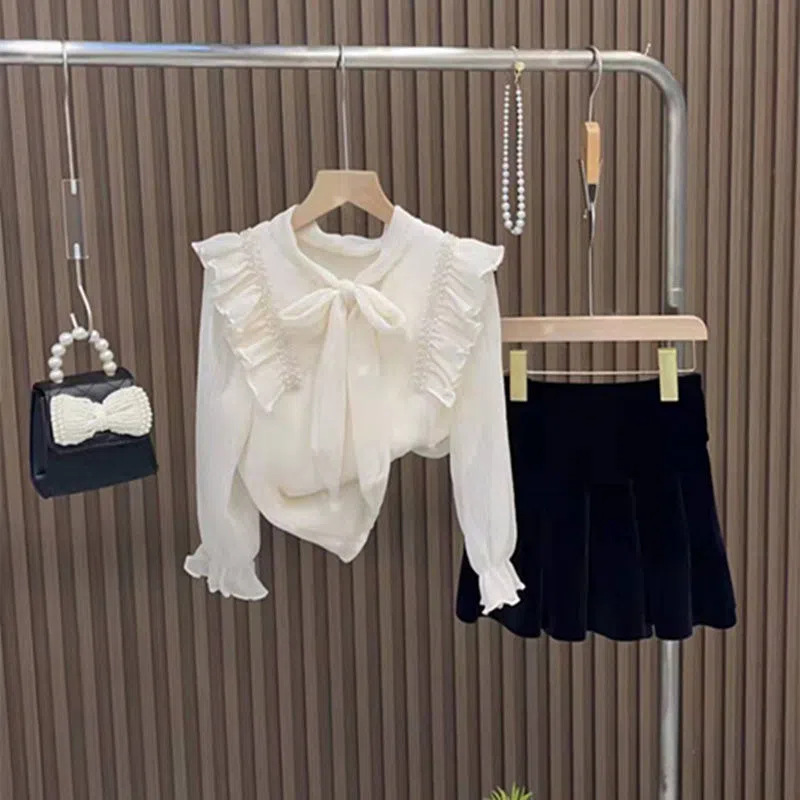 봄 신상 아동복 쉬폰 셔츠 긴팔 상의 레트로 한국 스타일 진주 장식 상의 중대형 여아 트렌디 스타일