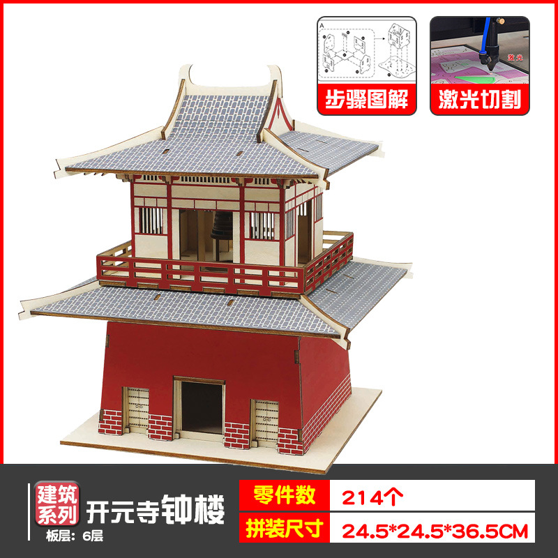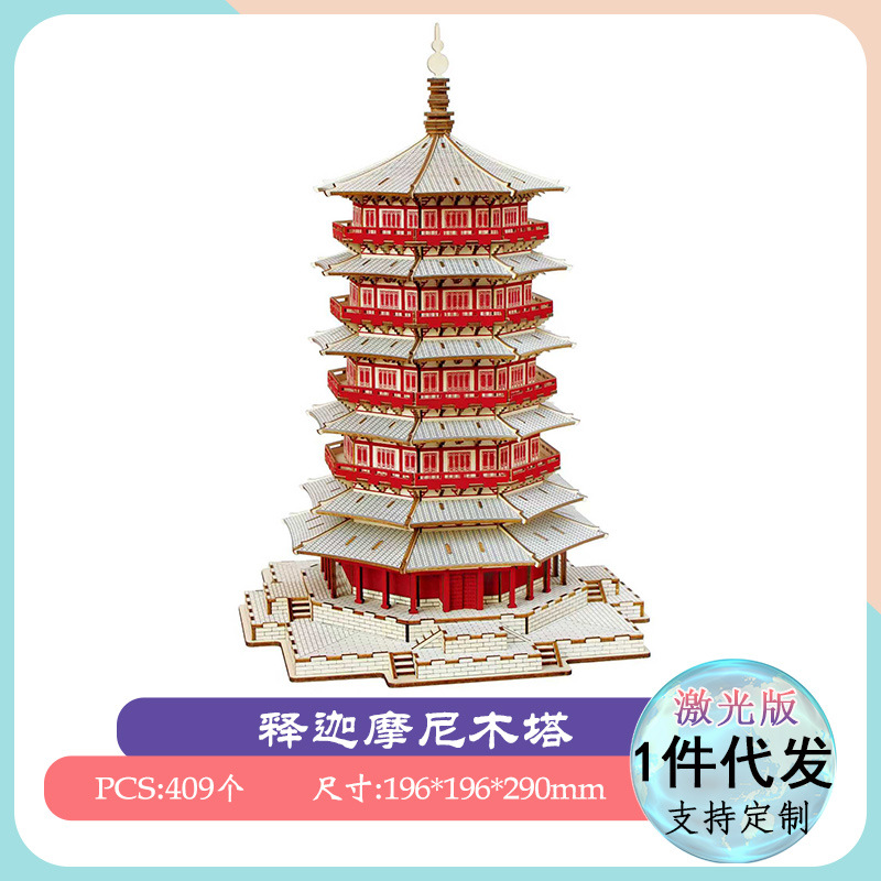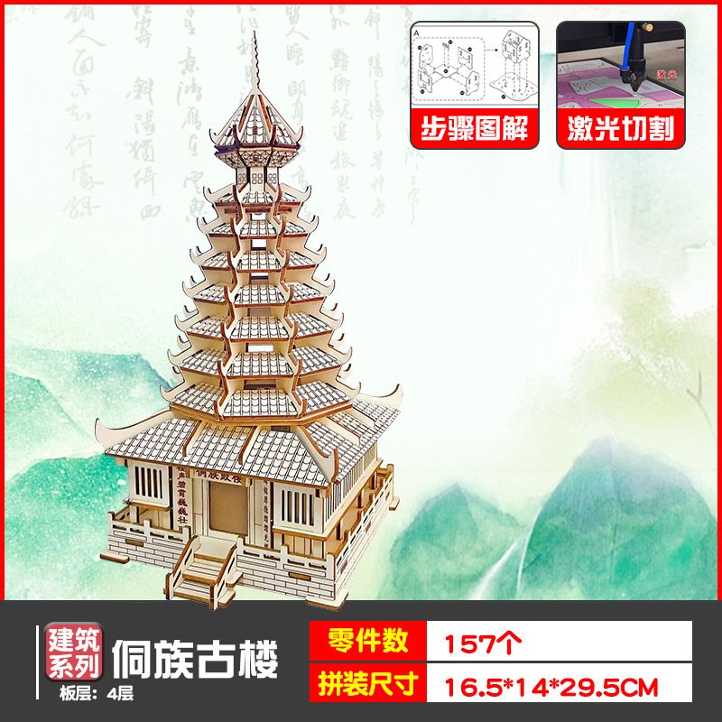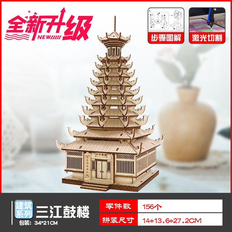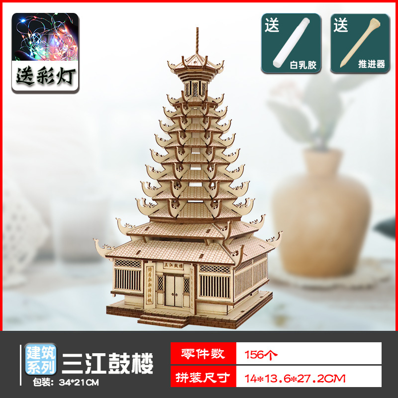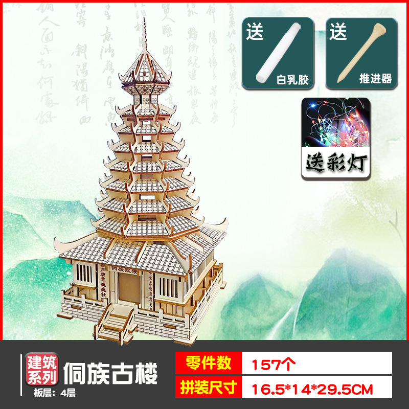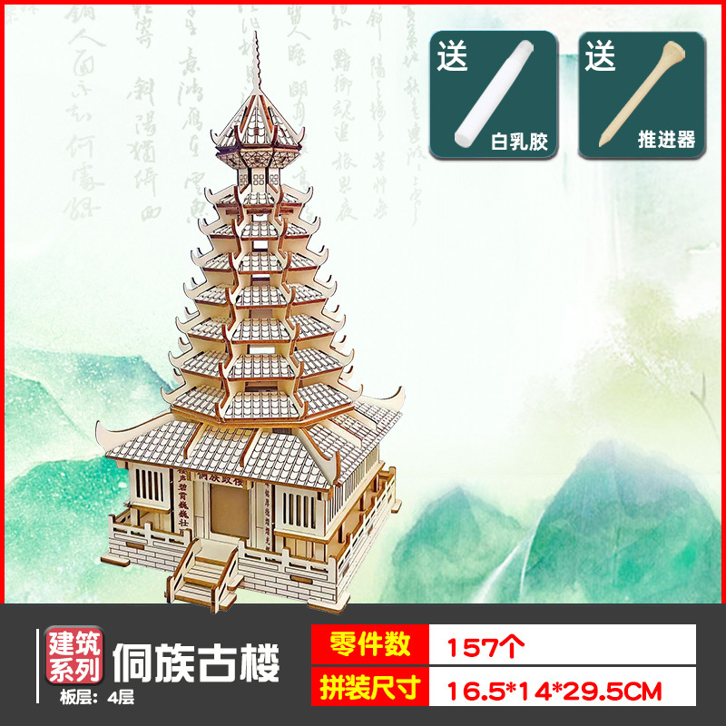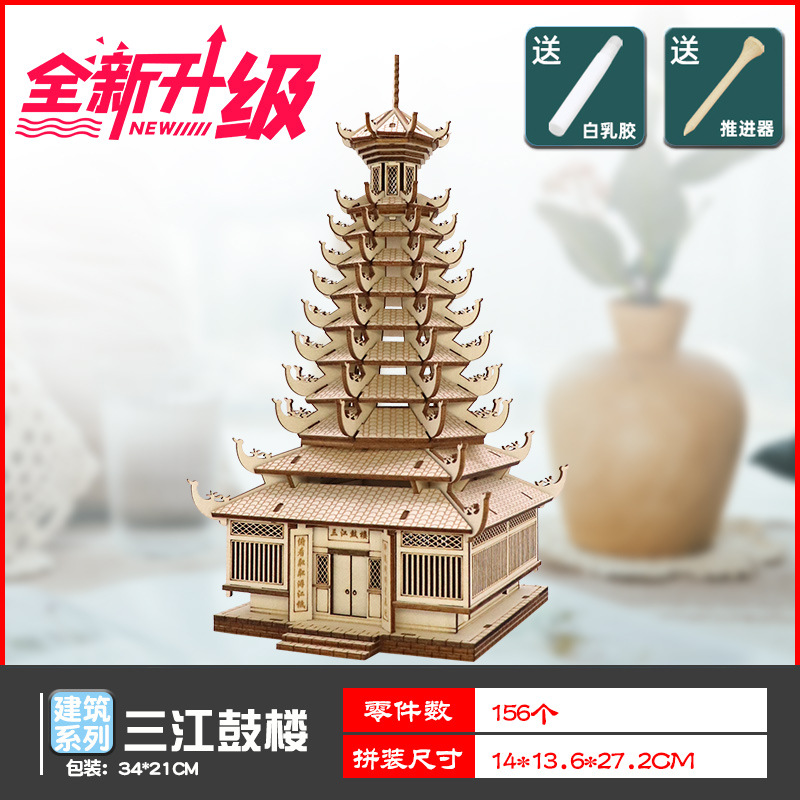 나무 모형 조립 장난감 퍼즐 어린이 도매 나무 시뮬레이션 구이저우 동 드럼 타워 광시 빌딩 모델스토어 가기