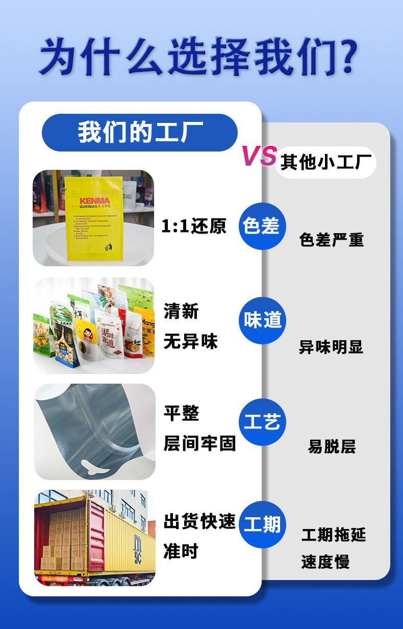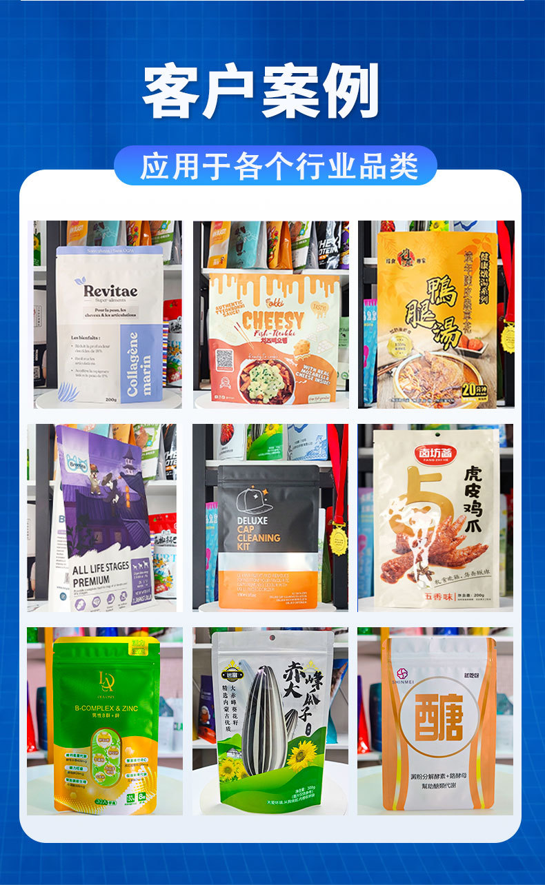 2.支持一件起订,不用担心起订量限制;袋型不限、工艺不限,小批量也能享受定制服务,满足新产品试产与小众市场需求。