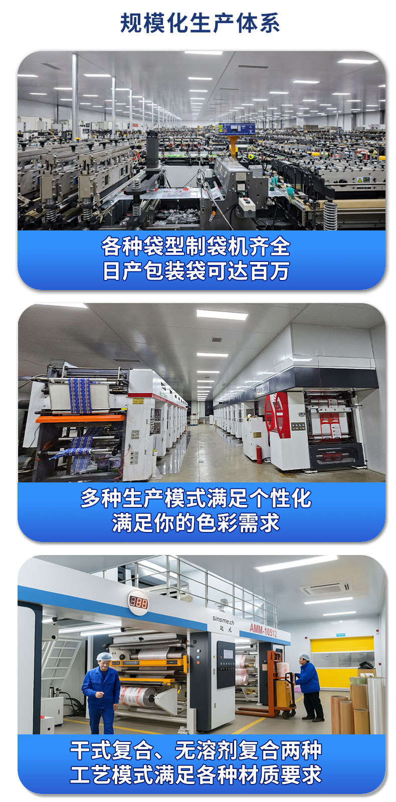 7.拥有40+台先进设备:复合机、印刷机、分切机、制袋机等,日产超100万条,大货生产也能稳定按期交付。