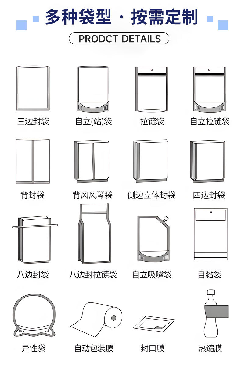 4.提供十余种袋型选择:三边封袋、自立袋、自立拉链袋、八边封袋、背封风琴袋、异形袋、吸嘴袋等适用于冻干食品、坚果、宠粮、零食、干货、粮油等多品类食品包装。