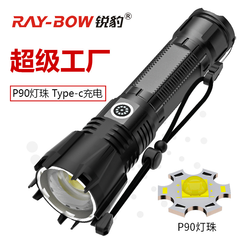 RAY-BOW 강력한 빛 손전등 충전식 P90 장거리 라이트 야외 집중 조명 확대 줌 손전등 하이킹 캠핑용스토어 가기