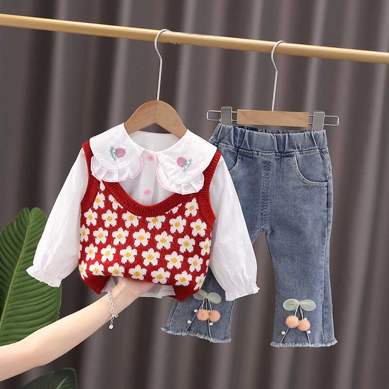 캐주얼 소녀 인형 칼라 탑 가을 니트 외부 패션 작은 꽃 청바지 어린이 세트 도매스토어 가기