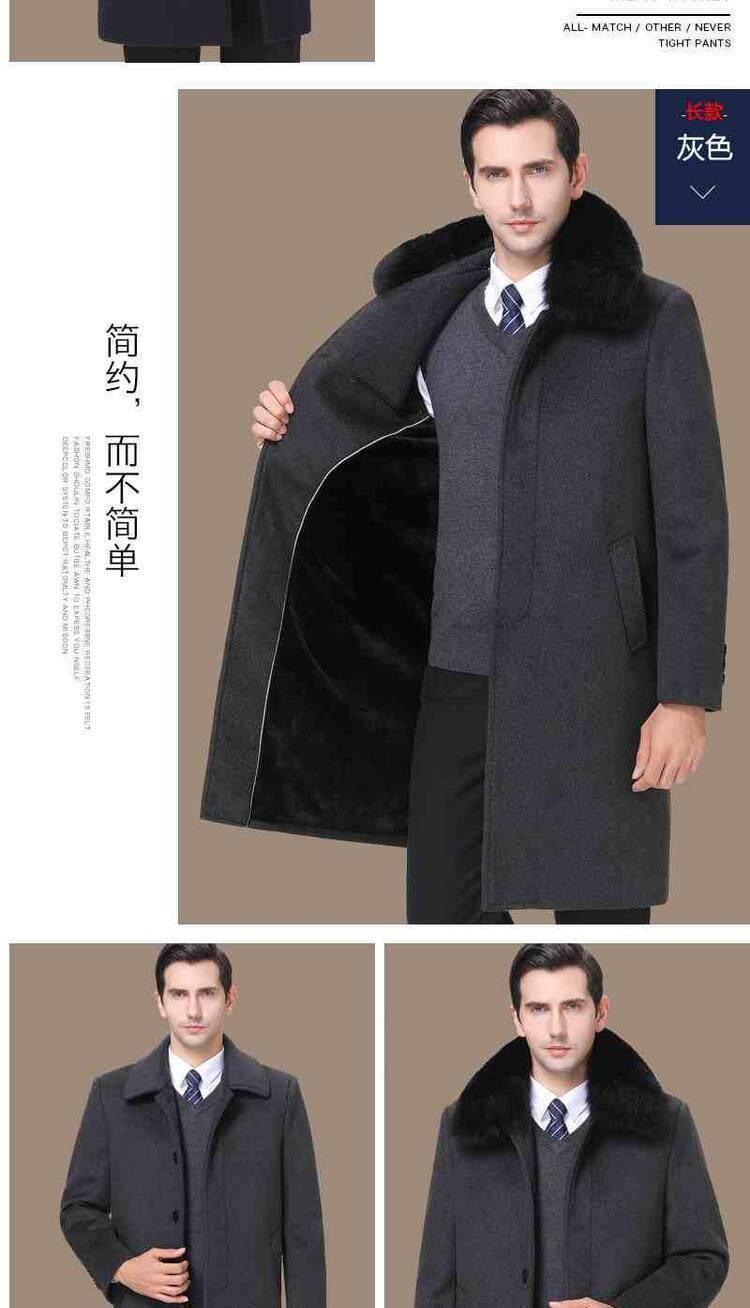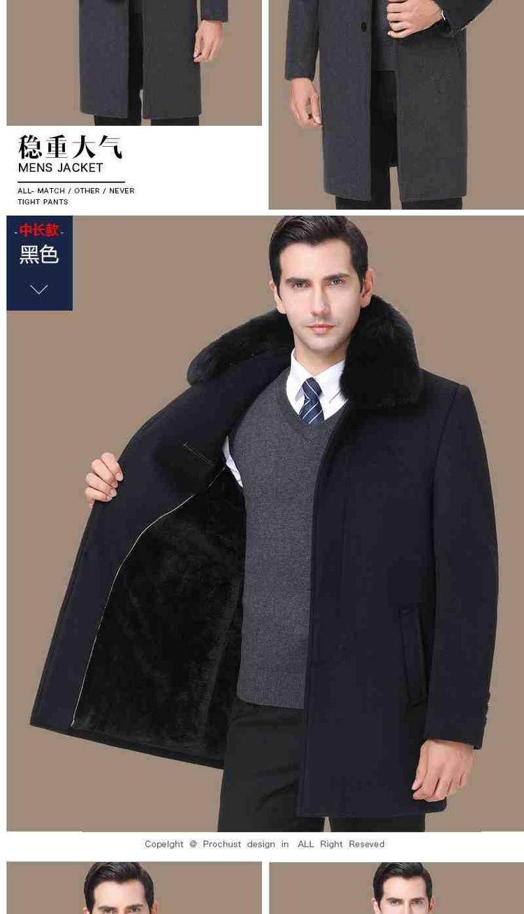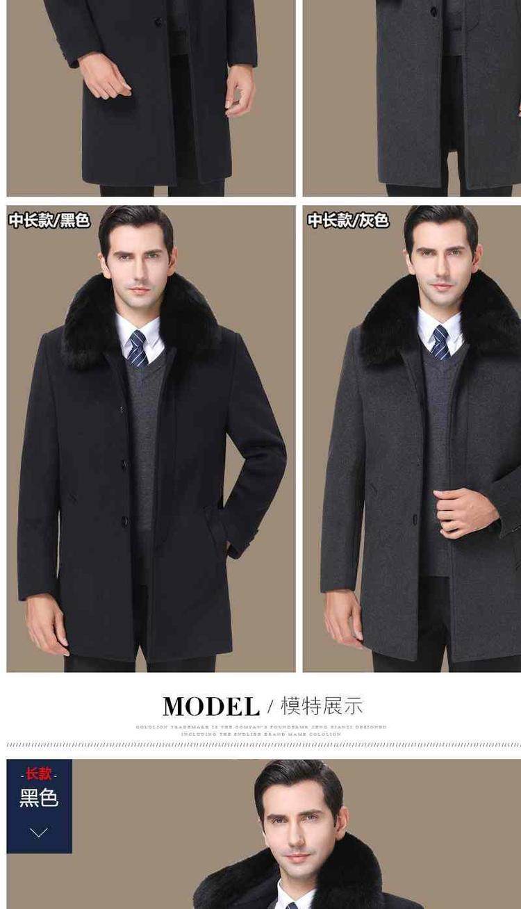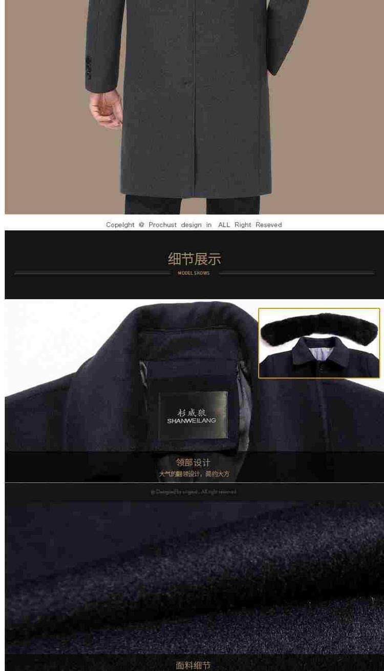 品牌|杉威狼|;材质|羊毛|;羊毛含量|30%(含-49%(含|;尺码|165/S|170/M|175/L|180/XL|185/XXL|190/3XL|195/4XL|;面料分类|毛呢大衣料|;图案|纯色|;领型|翻领|;衣门襟|单排扣|;颜色分类|灰色-长款【不加绒不带毛领】|黑色-长款【不加绒不带毛领】|灰色-长款【加绒加厚獭兔真毛领】|黑色-长款【加绒加厚獭兔真毛领】|灰色-中长款【不加绒不带毛领】|黑色-中长款【不加绒不带毛领】|灰色-中长款【加绒加厚獭兔真毛领】|黑色-中长款【加绒加厚獭兔真毛领】|;货号|SL11718|;细分风格|商务休闲|;基础风格|商务绅士|;上市年份季节|2018年冬季|;适用场景|其他休闲|;衣长|中长款|;服装版型|宽松|;款式细节|带毛领|;服饰工艺|免烫处理|;适用对象|中年|;下摆设计|本布下摆|;服装口袋样式|侧缝插袋|;销售渠道类型|纯电商(只在线上销售|;材质成分|聚酯纤维57.2%|羊毛42.8%|